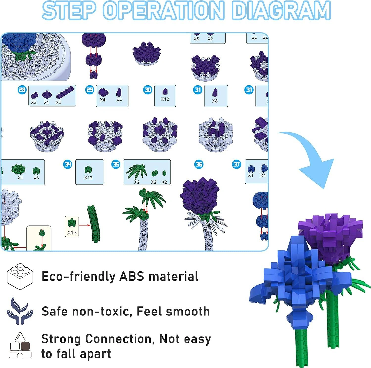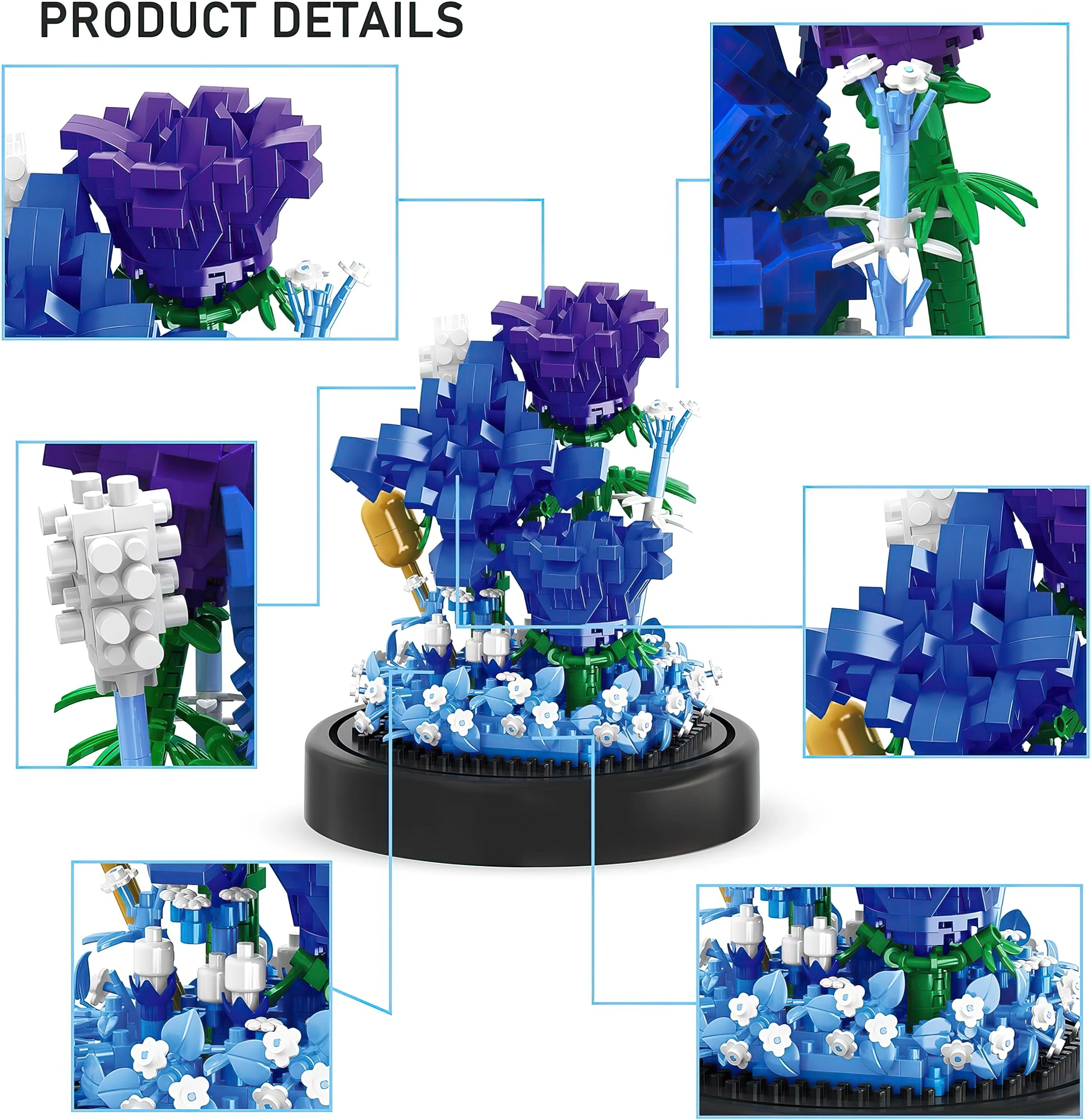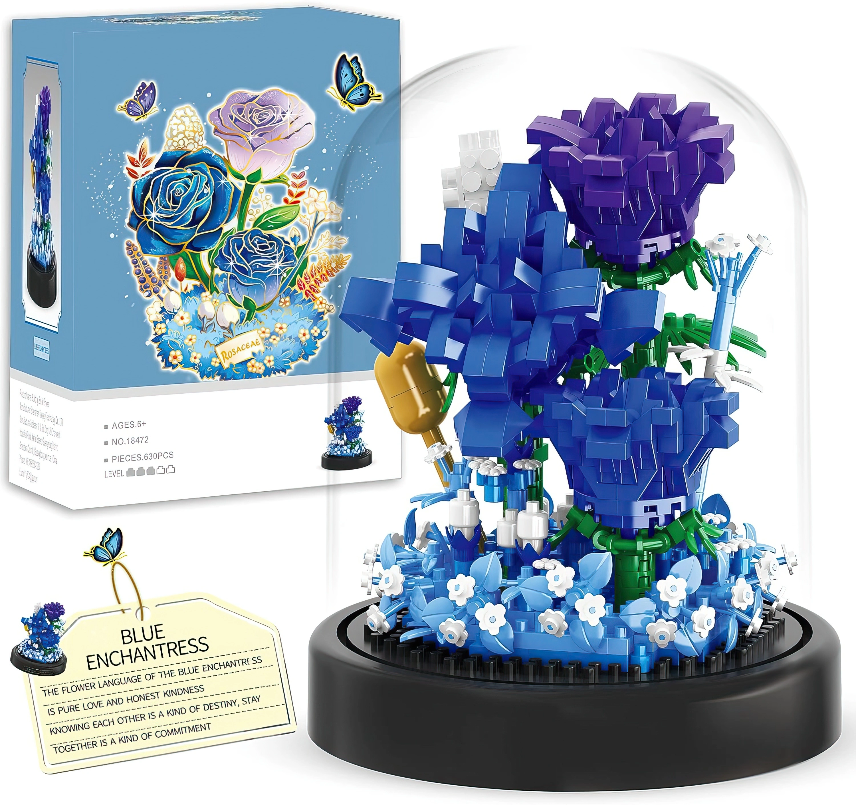 QLT QIAOLETONG Flower Bouquet Building Set, 630 PCS Blue Rose Mini Building Blocks Kit for Adults, Flowers Botanical Collection for Home Decor, Mother's Day for Her Mom Women Wife Girlfriend