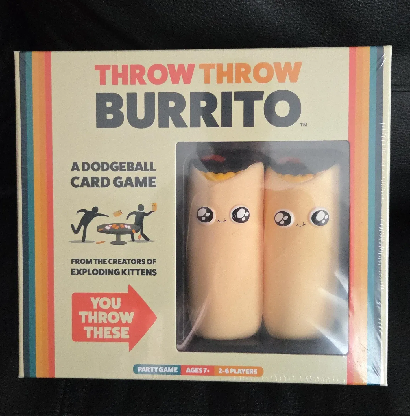 Selling a brand new, sealed copy of Throw Throw Burrito, the dodgeball card game from the creators of Exploding Kittens! It's a fun party game for ages 7+ and can be played with 2-6 players. Get ready to throw some burritos!