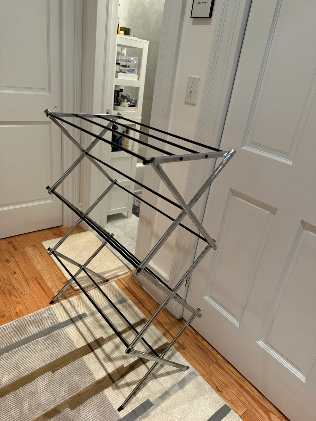 This is a folding clothes drying rack. It is a great way to dry clothes indoors, especially if you don't have a lot of space. It folds up easily for storage. It is in great condition and is ready to use!