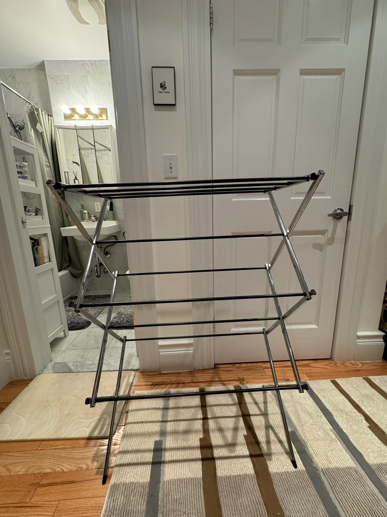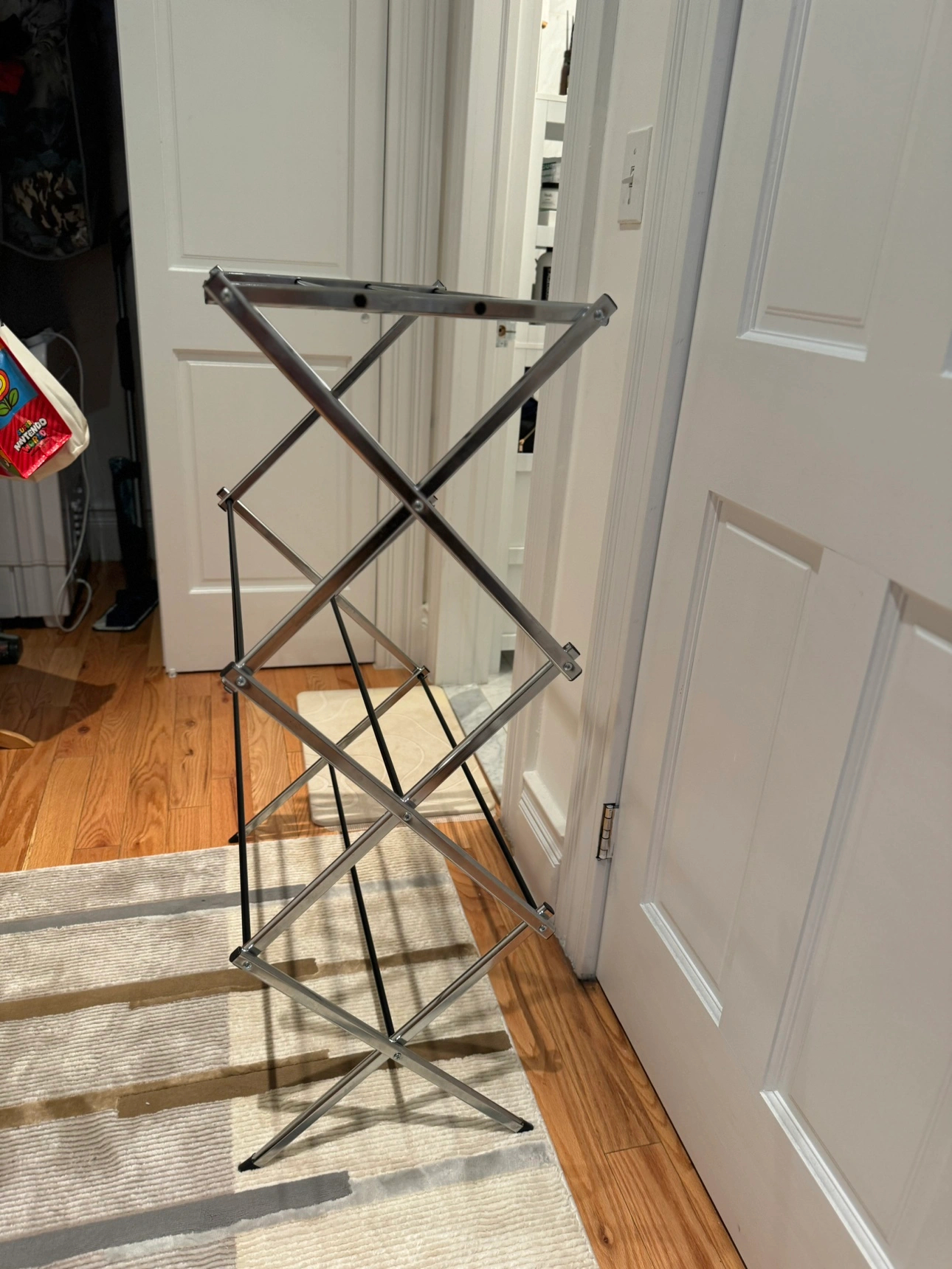 This is a folding clothes drying rack. It is a great way to dry clothes indoors, especially if you don't have a lot of space. It folds up easily for storage. It is in great condition and is ready to use!