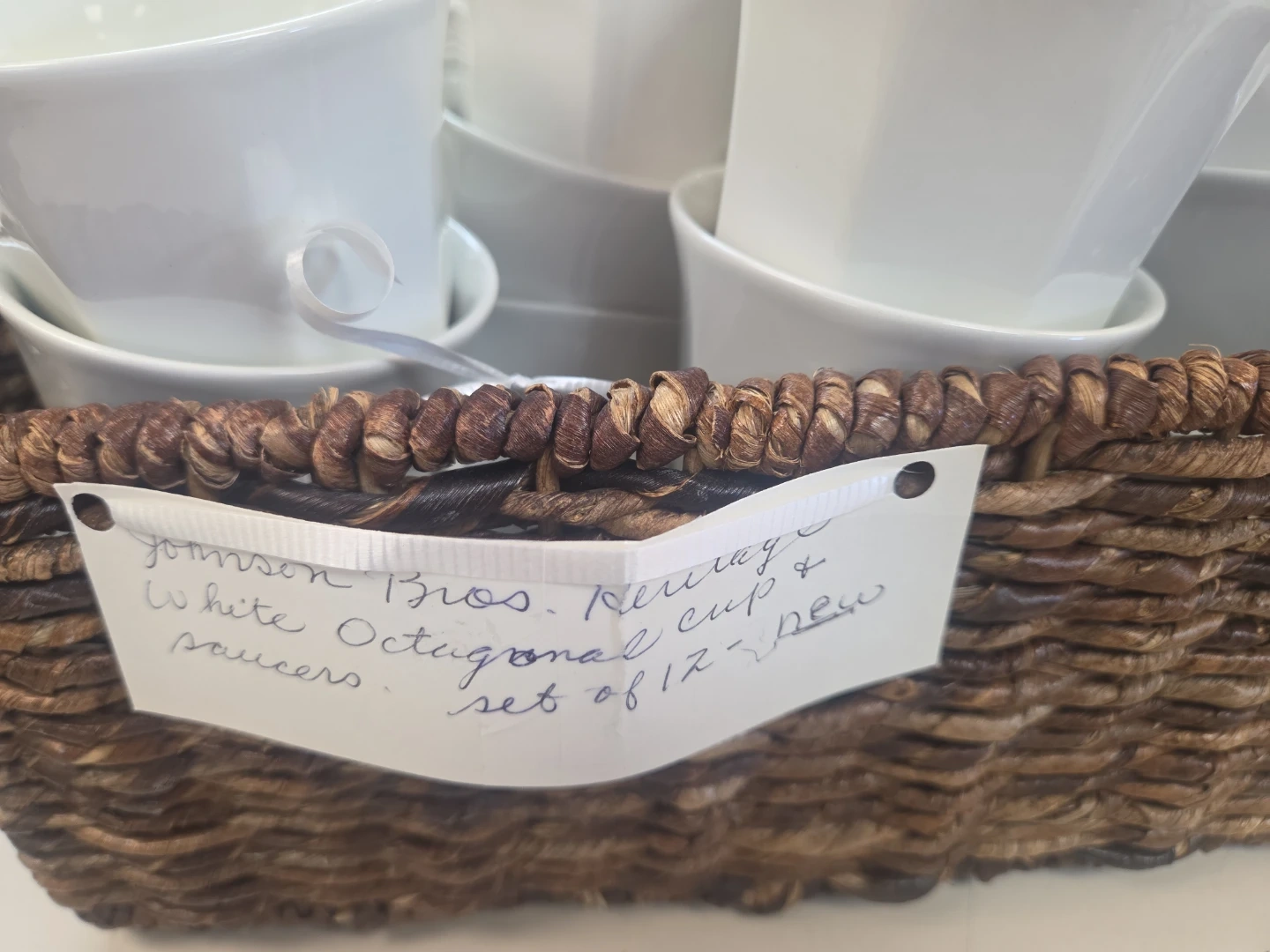 Johnson Bros. "Heritage" set of 12 white octagonal cups and saucers. White porcelain material. Perfect for hosting tea parties or everyday use! Wonderful condition!