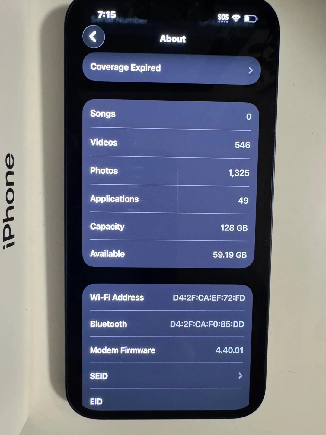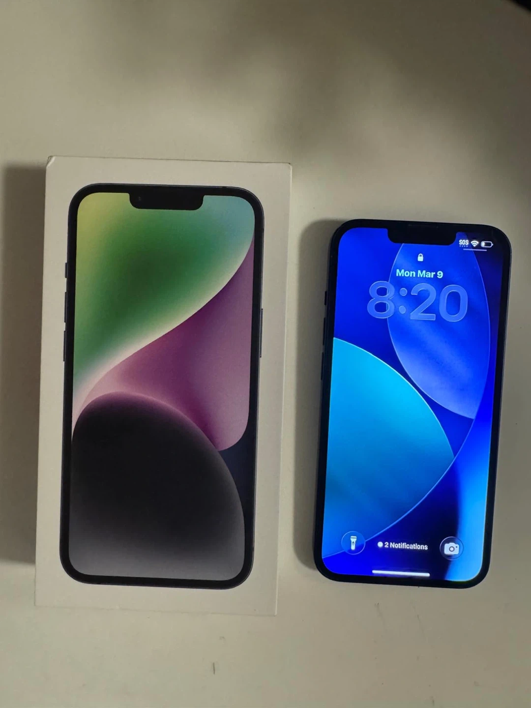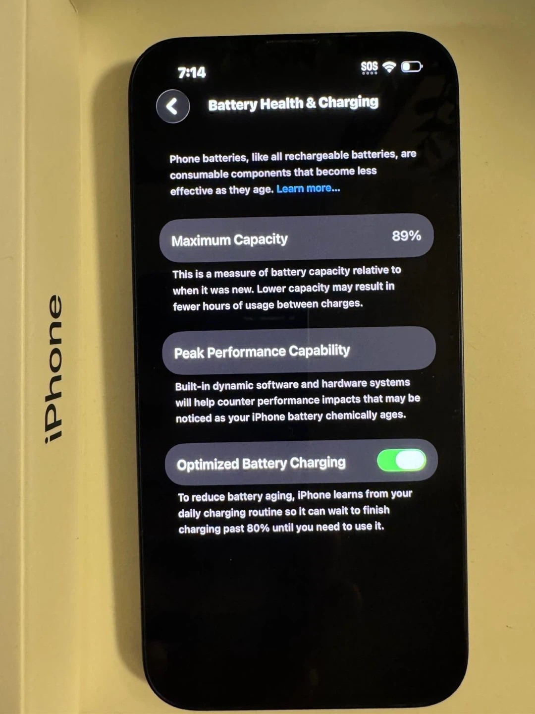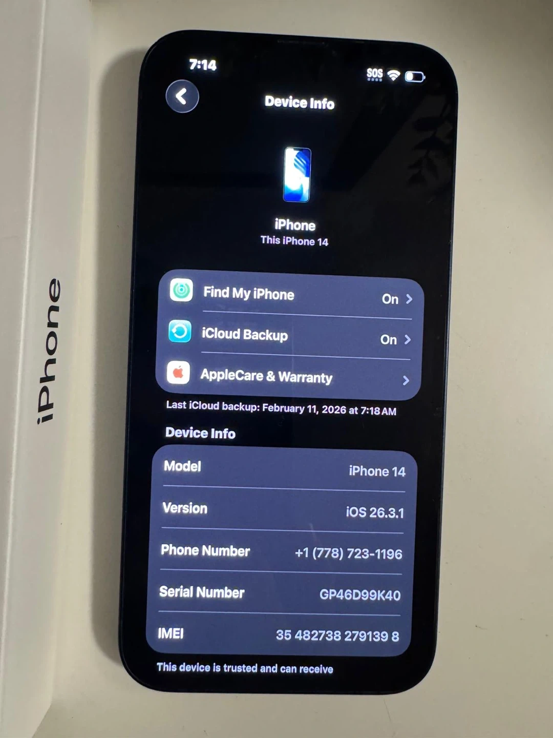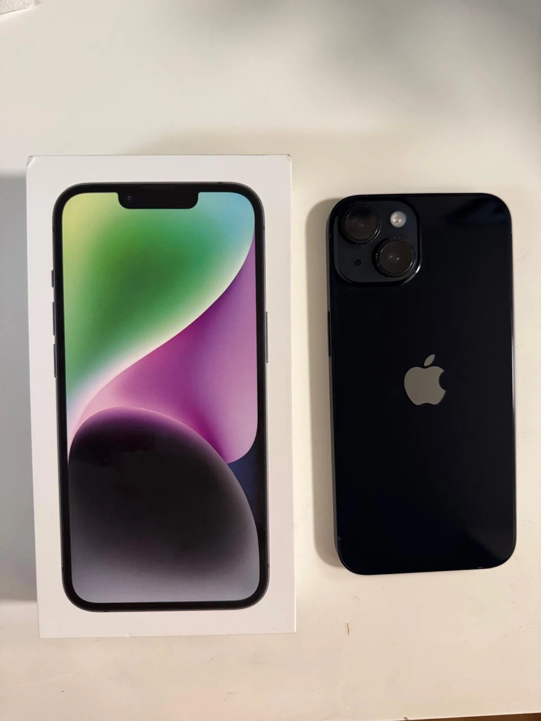 Apple iPhone 14 with 128GB capacity. It's in the Midnight colour. Battery health is at 89%. Includes original box.