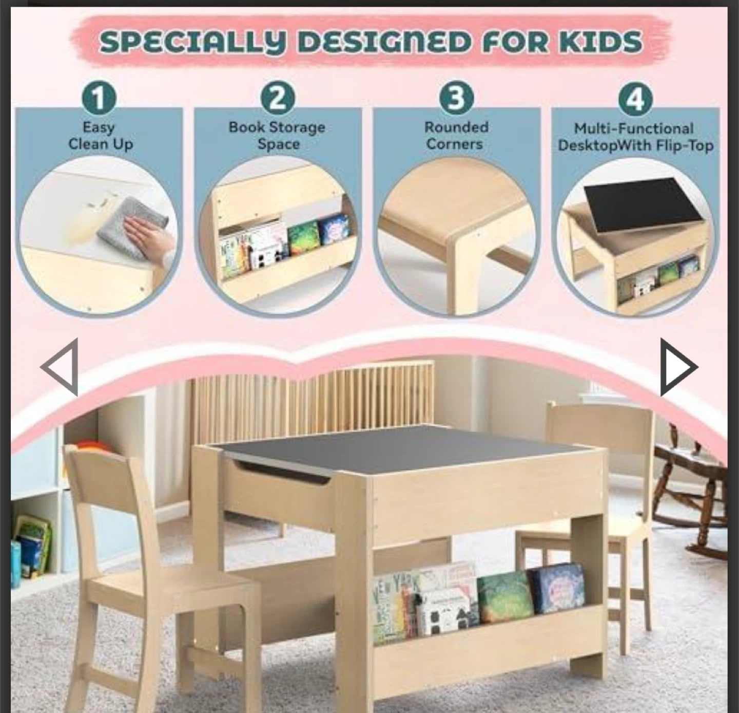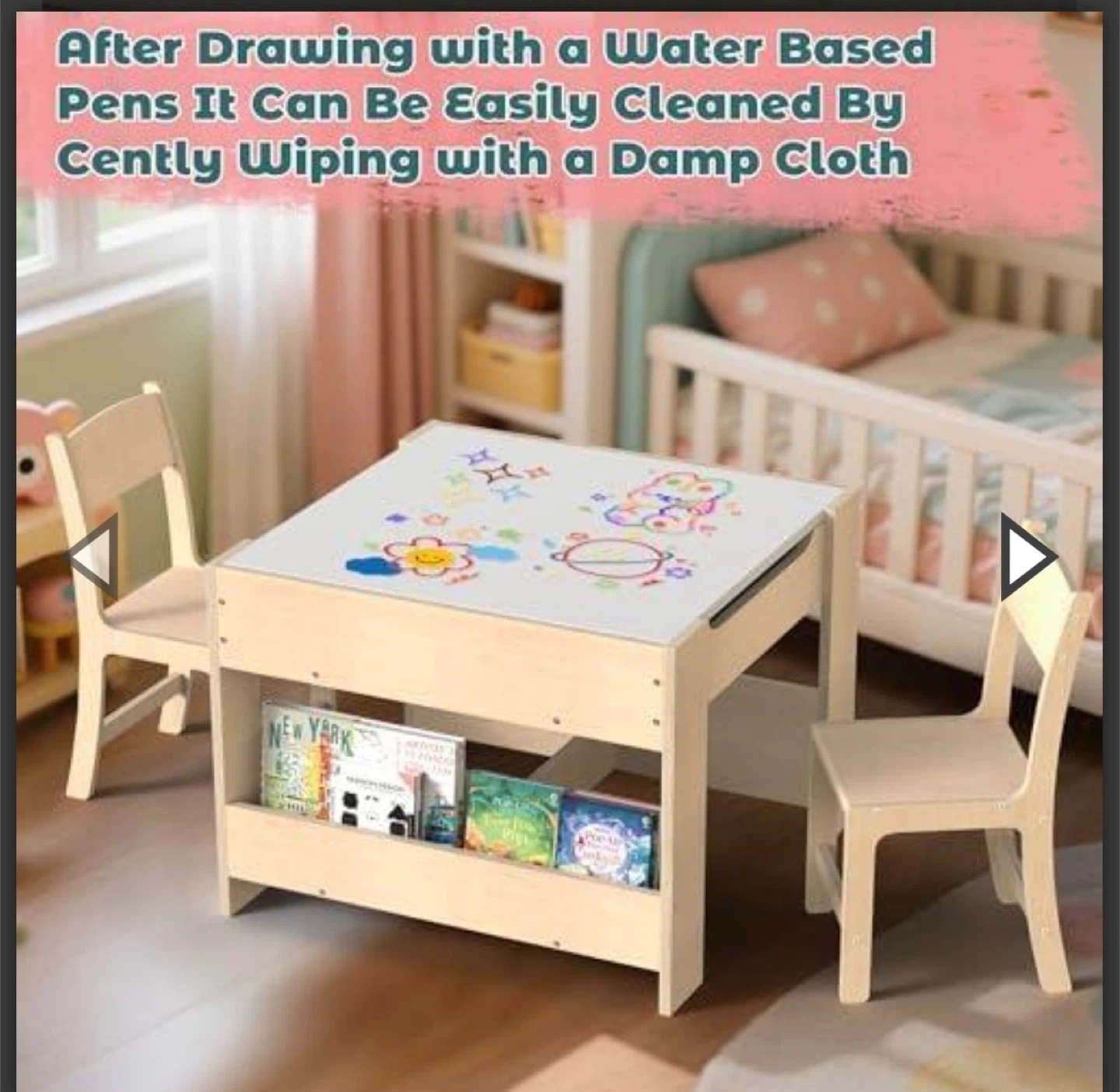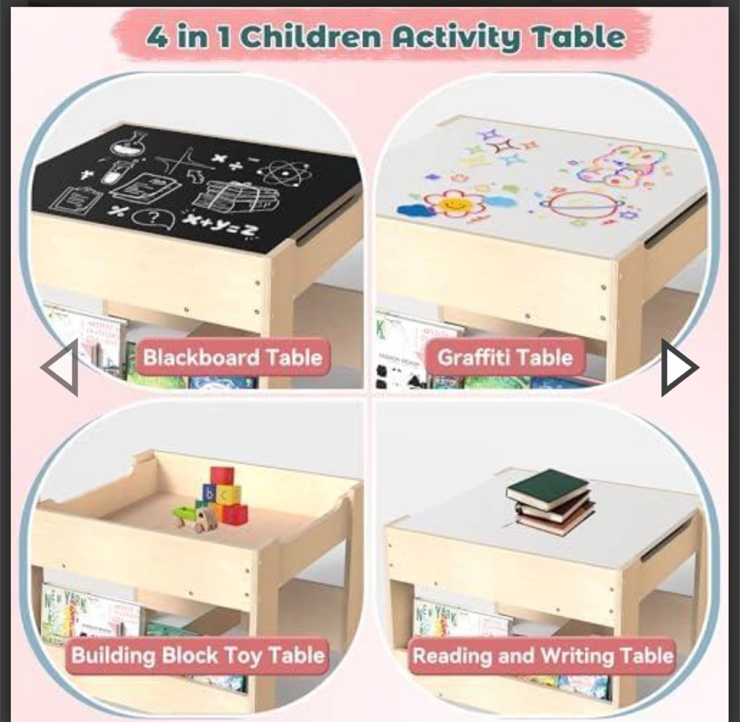 This versatile children's activity table features four different surfaces: a chalkboard, a drawing surface, a building block area, and a reading/writing space. It includes convenient book storage shelves underneath. Rounded corners for safety.