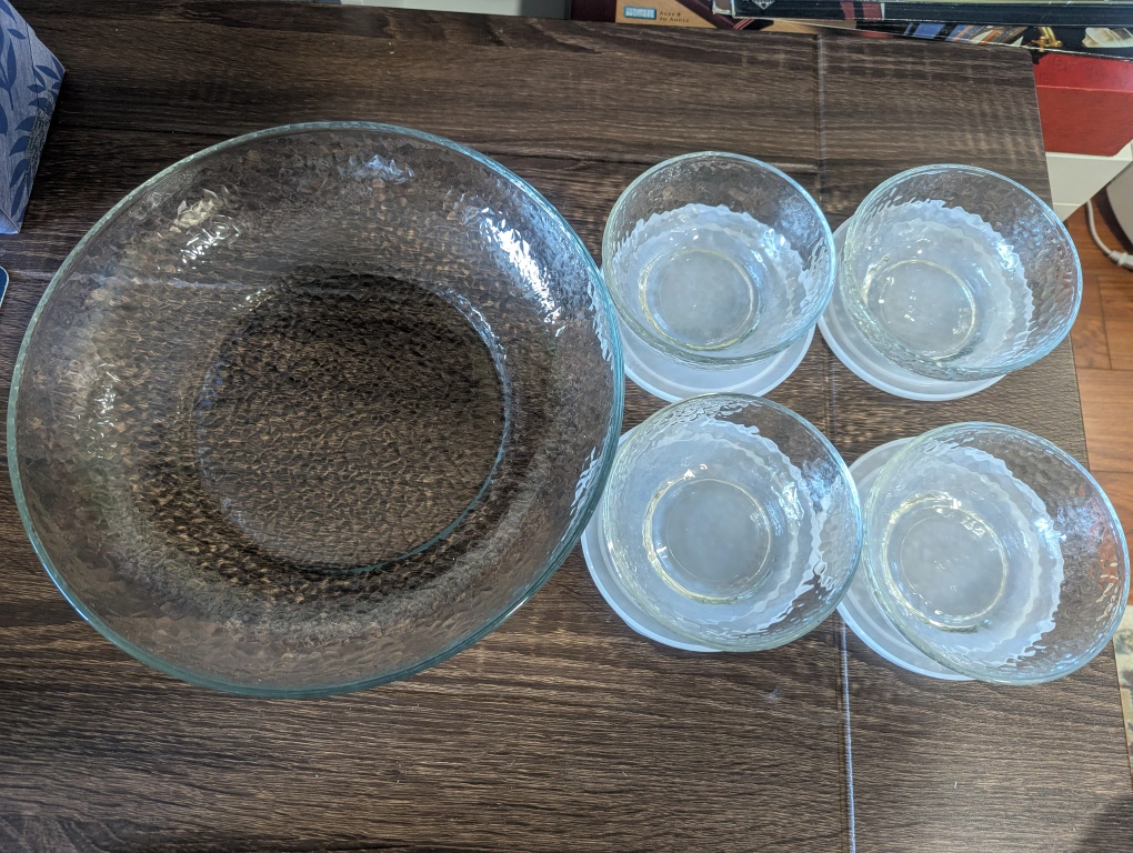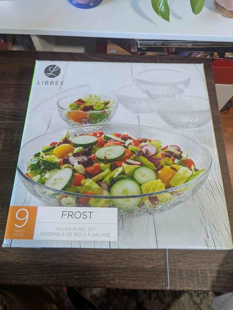 Selling a Libbey Frost glass salad bowl set, complete with one large glass bowl, four smaller glass bowls and 4 plastic lids. The bowls are in great condition, never been used.