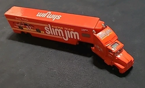 This 1997 Edition Racing Champions NASCAR #57 Jason Keller 1:87 Transporter with Car set features the iconic Slim Jim Racing Team transporter and a 1:64 scale replica of Jason Keller's race car. Both are in vibrant multi-color schemes. Crafted from durable diecast material, this model is a must-have for enthusiasts and collectors. The box is unopened, ensuring the piece remains pristine and is an excellent addition to any display. Celebrate the legacy of racing with this meticulously detailed model.