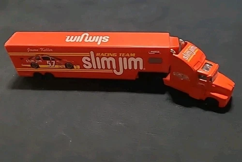 This 1997 Edition Racing Champions NASCAR #57 Jason Keller 1:87 Transporter with Car set features the iconic Slim Jim Racing Team transporter and a 1:64 scale replica of Jason Keller's race car. Both are in vibrant multi-color schemes. Crafted from durable diecast material, this model is a must-have for enthusiasts and collectors. The box is unopened, ensuring the piece remains pristine and is an excellent addition to any display. Celebrate the legacy of racing with this meticulously detailed model.