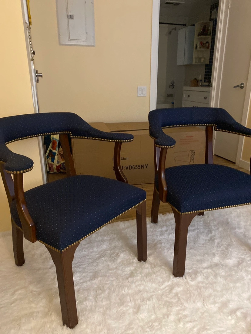 Beautiful blue chair with navy blue fabric and wooden frame. Only selling one because I bought two from antique dealer, but my small condo can really fit one. Happy to deliver :)