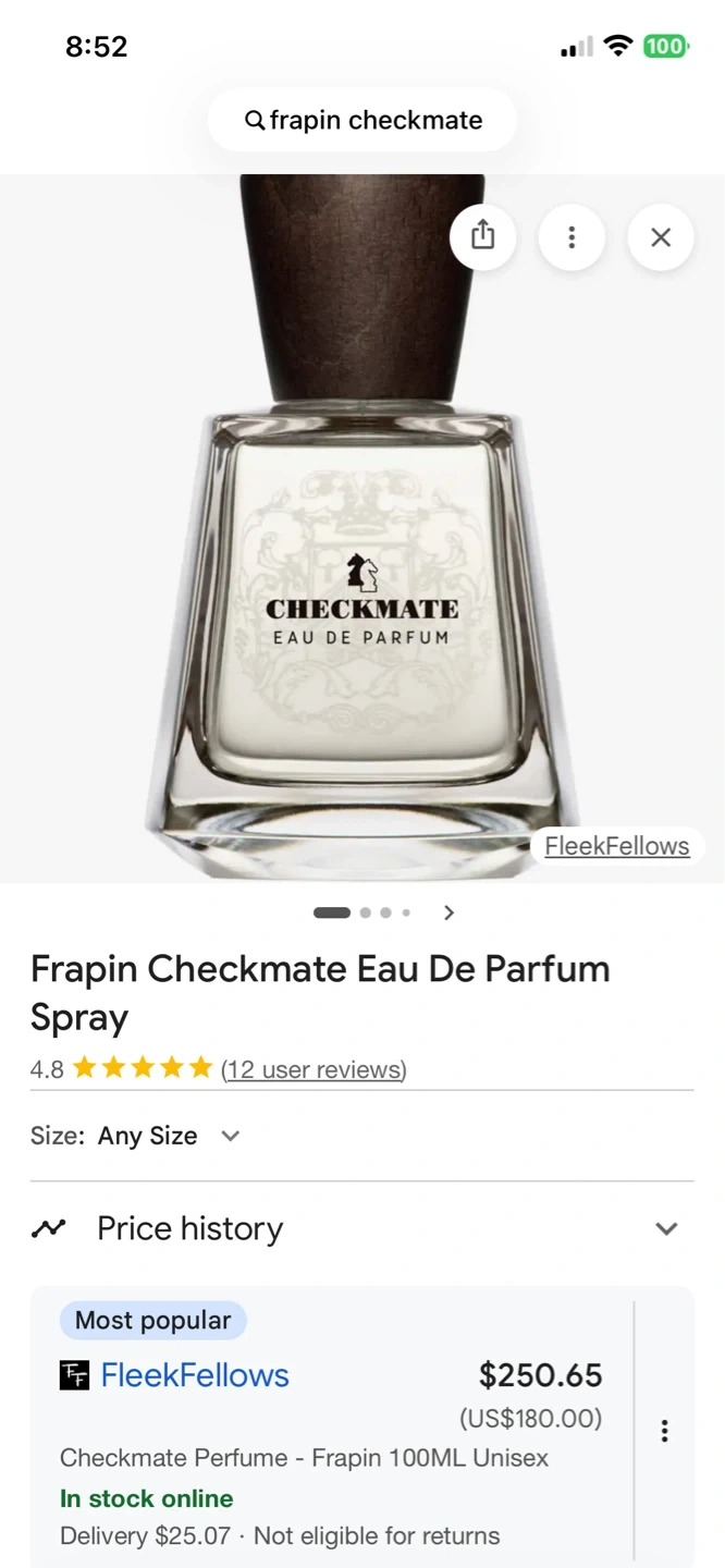 This is Frapin Checkmate Eau de Parfum, a unisex fragrance. It's presented in a 100ml bottle and comes with its original packaging. The scent is smooth with notes of Iris, Suede and Cashmere.