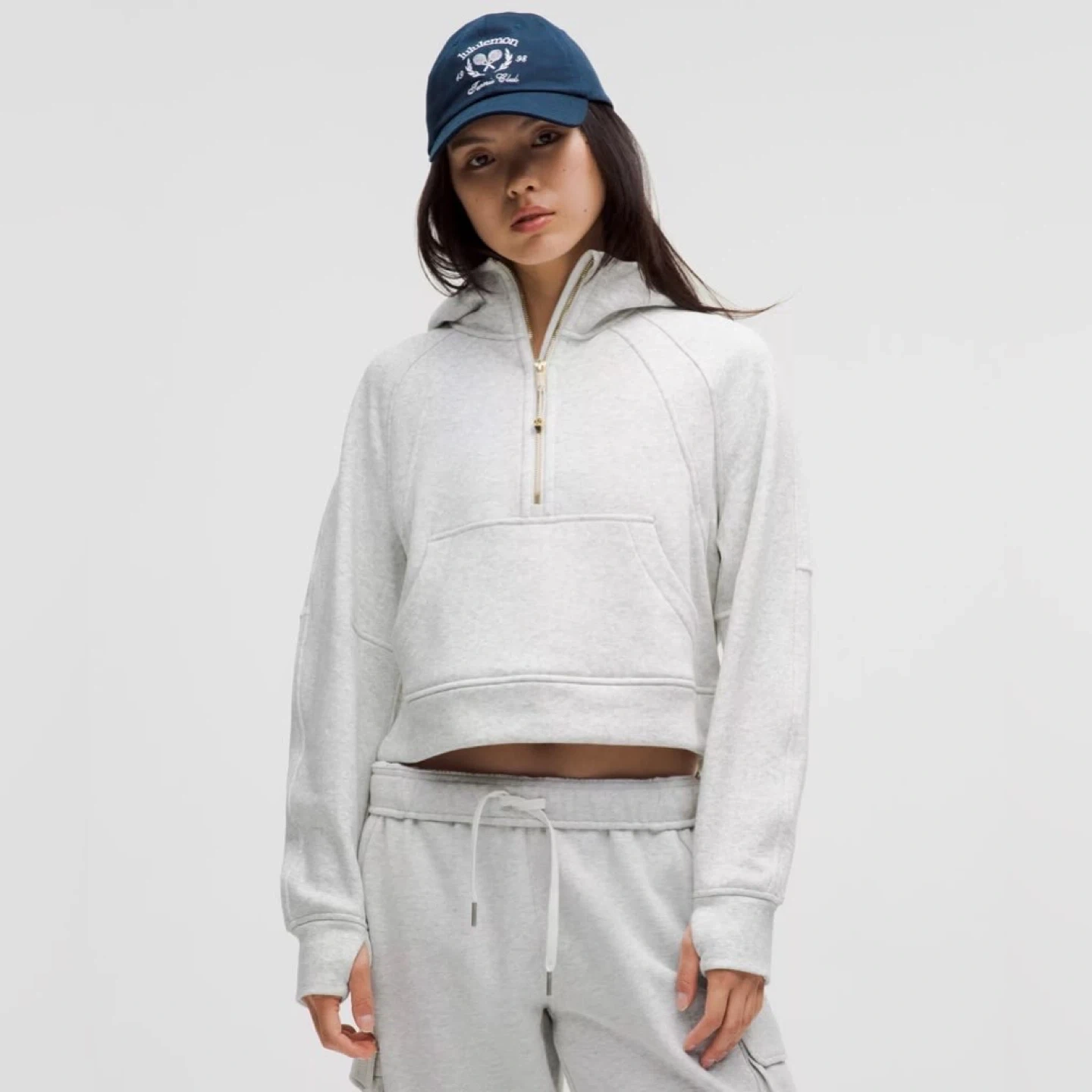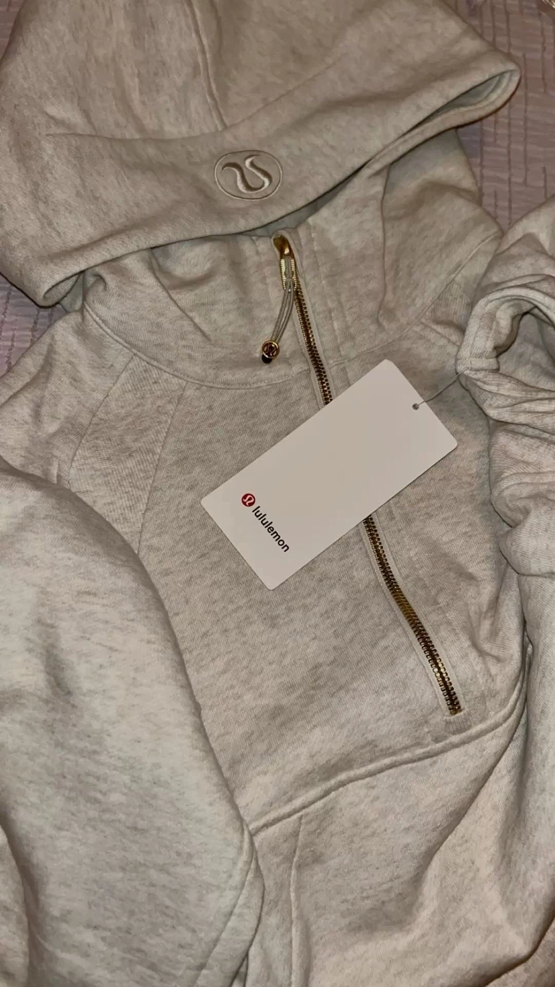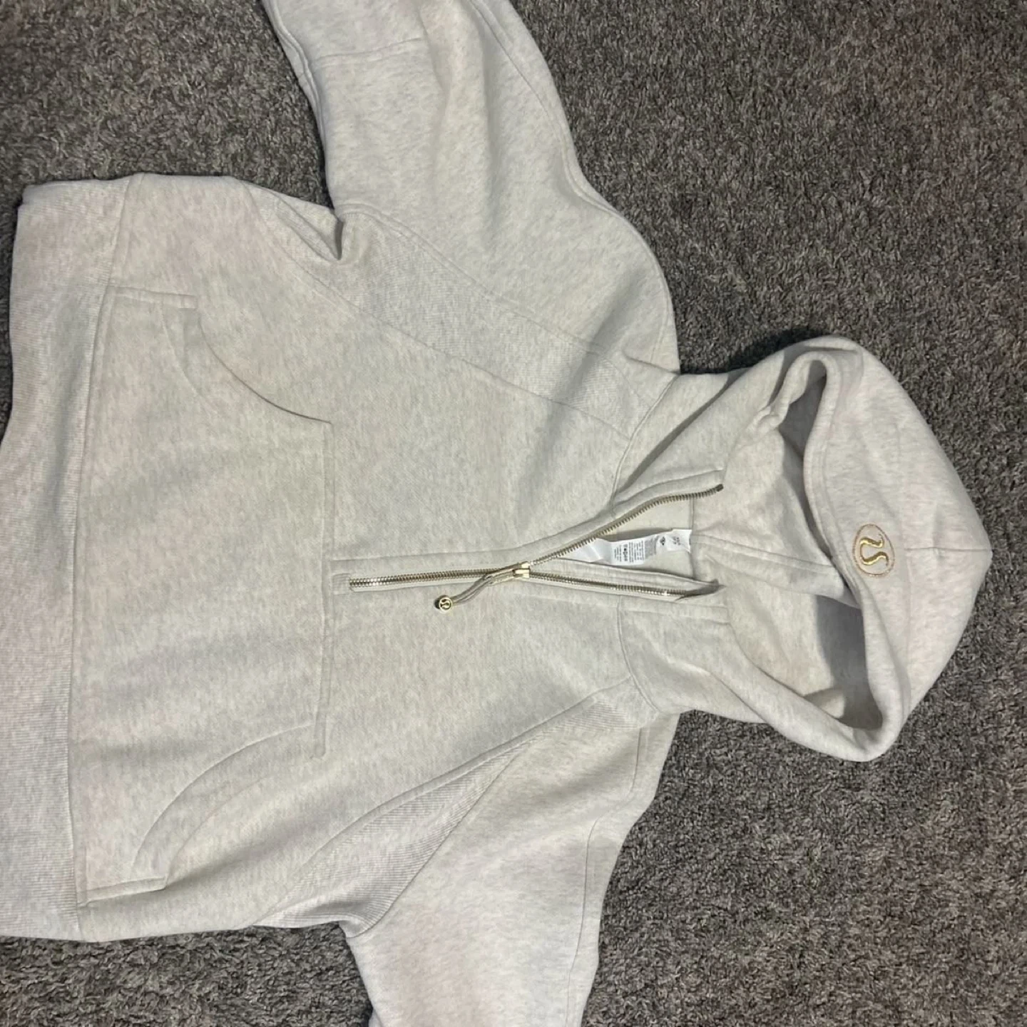 This Lululemon half zip hoodie is a size medium. It's made from a soft, cozy material perfect for cooler weather. This hoodie features a convenient front pouch pocket and a quarter-zip neckline.