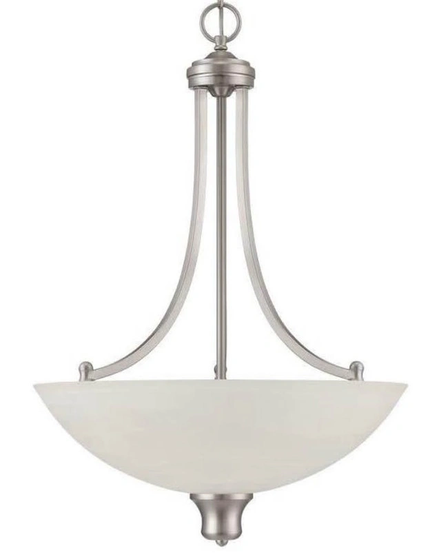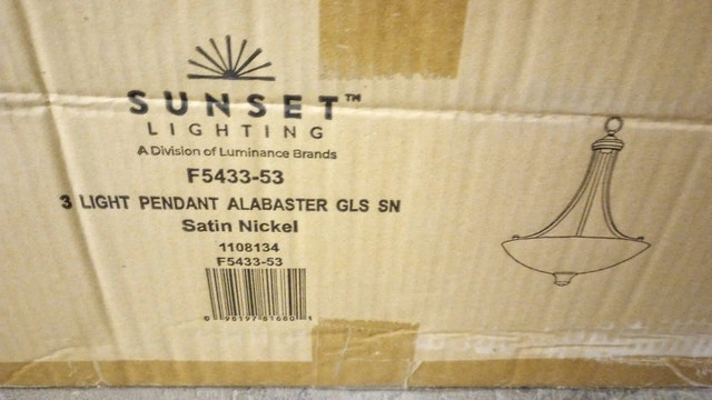 New pendant light fixture. A few available at $40 each. The Luminance Sunset Lighting F5433-53 Alton is a 3-light transitional pendant fixture featuring a bright satin nickel finish and alabaster glass bowl. Designed for dry indoor locations, this dimmable, 17.75-inch wide fixture uses three 100-watt medium-base bulbs to provide upward, ambient light. Dimensions: Approximately 17.75" x 25.50". Please see my other ads!
