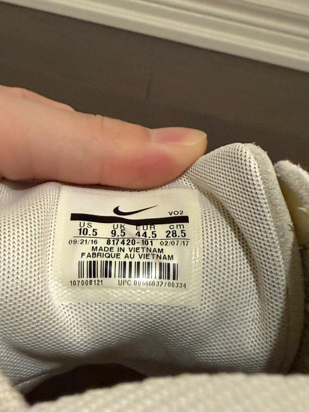 These Nike Air Force 1 Flyknit Mid Top sneakers are a stylish cream colour. They're a men's US size 10.5, EU 44.5, UK 9.5, and CM 28.5. Great for casual wear or sports!