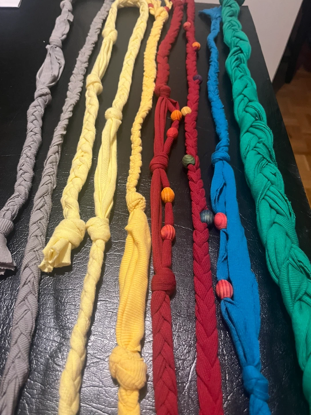 Handmade braided belts or chokers made from colourful fabric scraps. Several pieces available in different colours and patterns, some with wooden beads. These are great for adding a unique accent to outfits or as fun DIY projects!