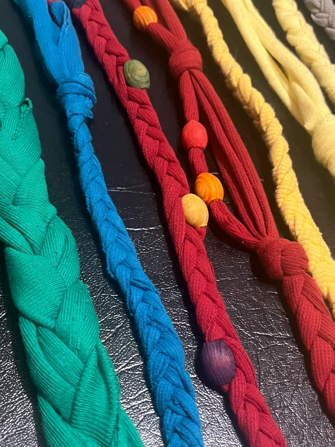 Handmade braided belts or chokers made from colourful fabric scraps. Several pieces available in different colours and patterns, some with wooden beads. These are great for adding a unique accent to outfits or as fun DIY projects!