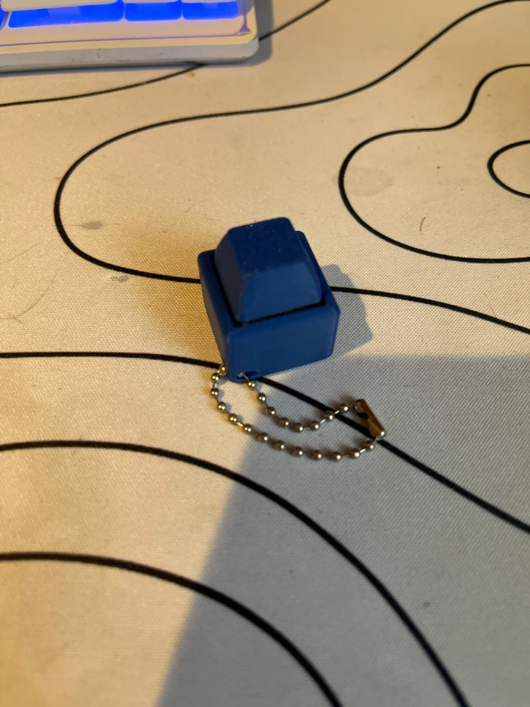 This is a blue keycap keychain. It's a fun accessory for any keyboard enthusiast. The keycap is made of plastic and attaches to a small metal ball chain.