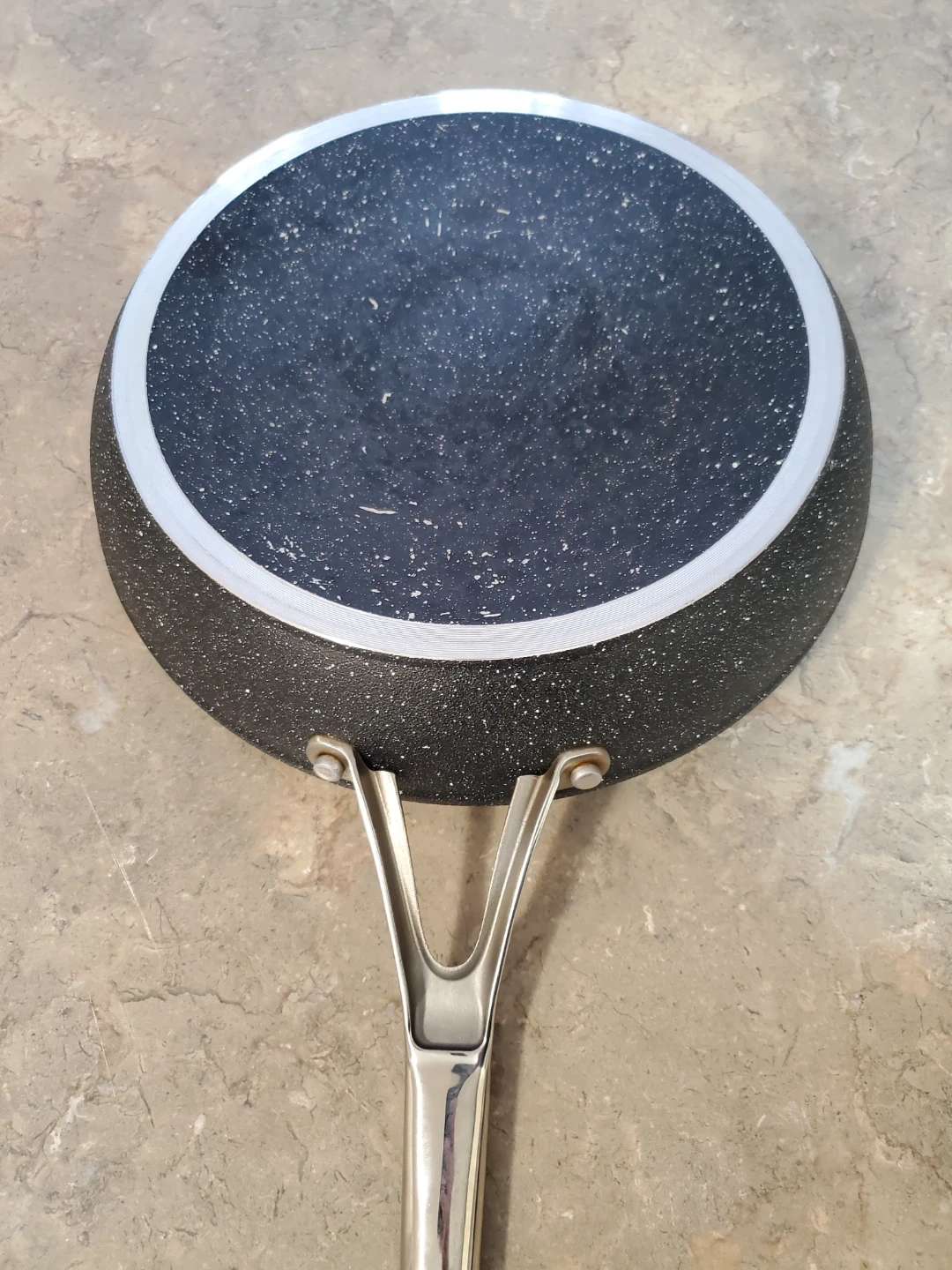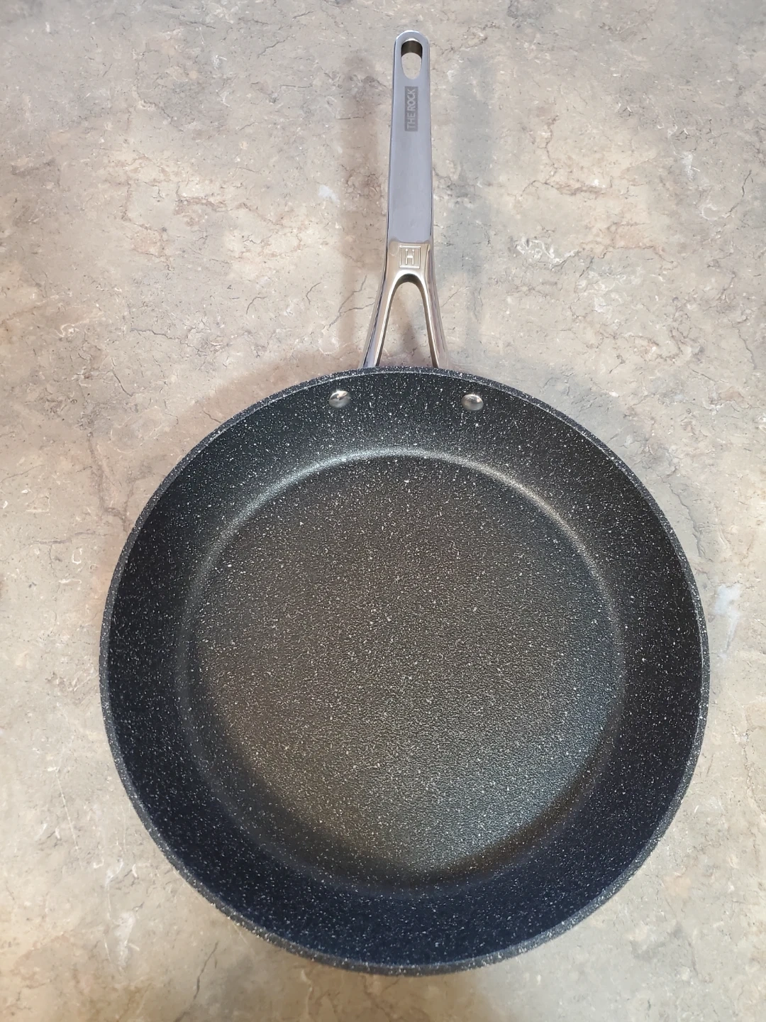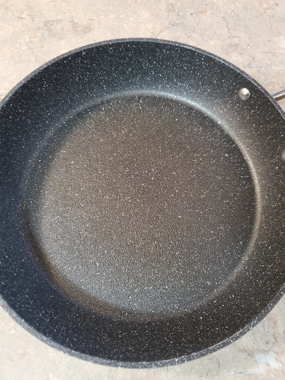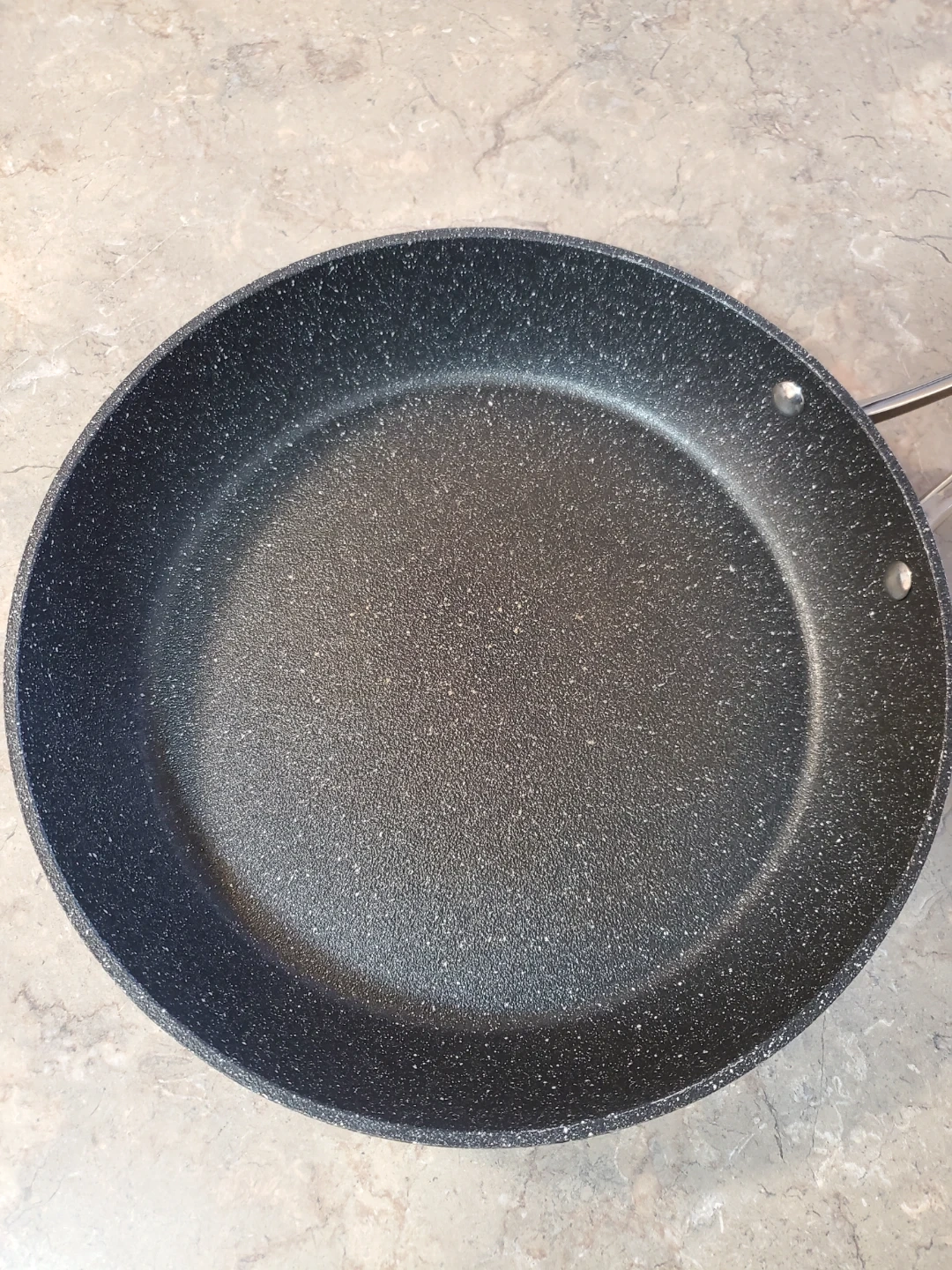 The Rock frying pan in good condition. Lightly used. 12" diameter. Dishwasher and oven safe up to 450 degrees. No lid (didn't come with one when purchased).