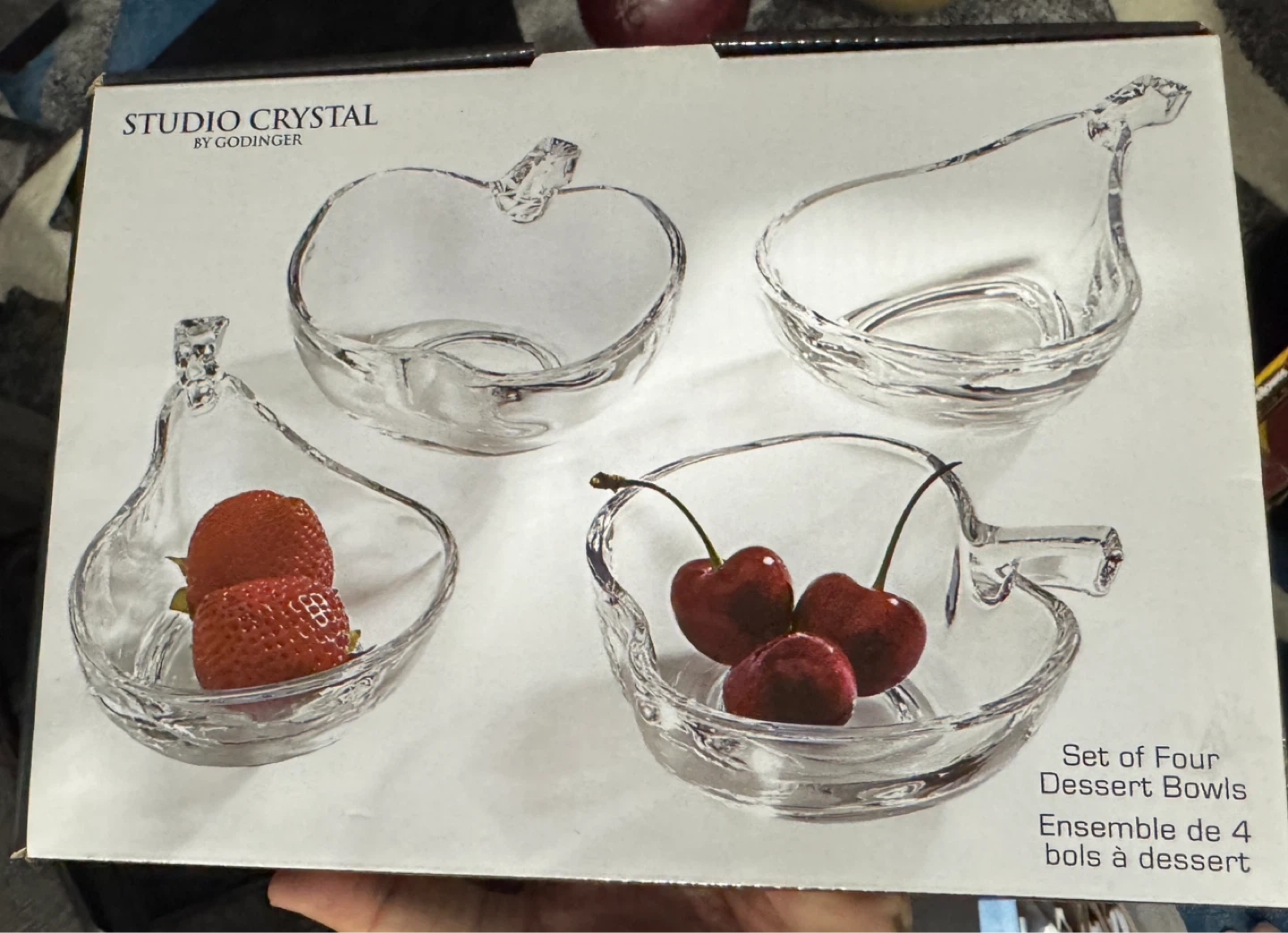 These beautifully crafted crystal dessert bowls come in a set of four with unique fruit shapes. They're ideal for serving small desserts or appetizers. Glass material.