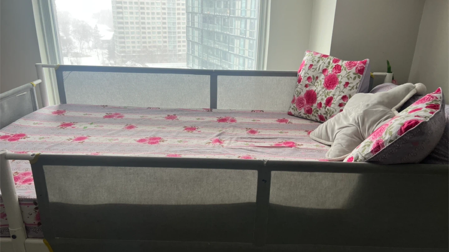 This white metal loft bed frame comes with grey fabric safety sides. It's perfect for creating extra space in a bedroom. It's sturdy and designed for single mattresses. Mattress included