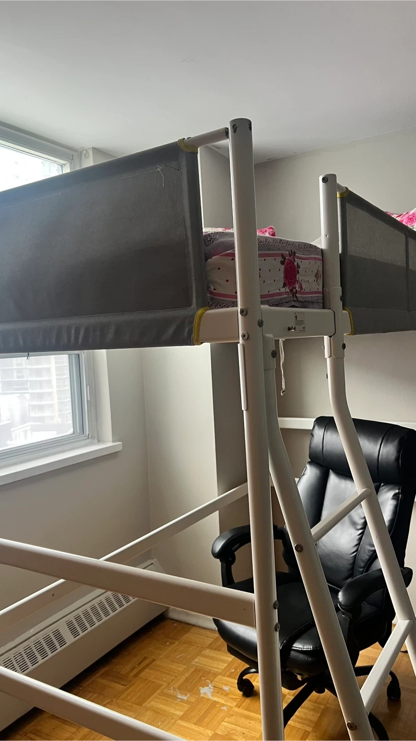 This white metal loft bed frame comes with grey fabric safety sides. It's perfect for creating extra space in a bedroom. It's sturdy and designed for single mattresses. Mattress included