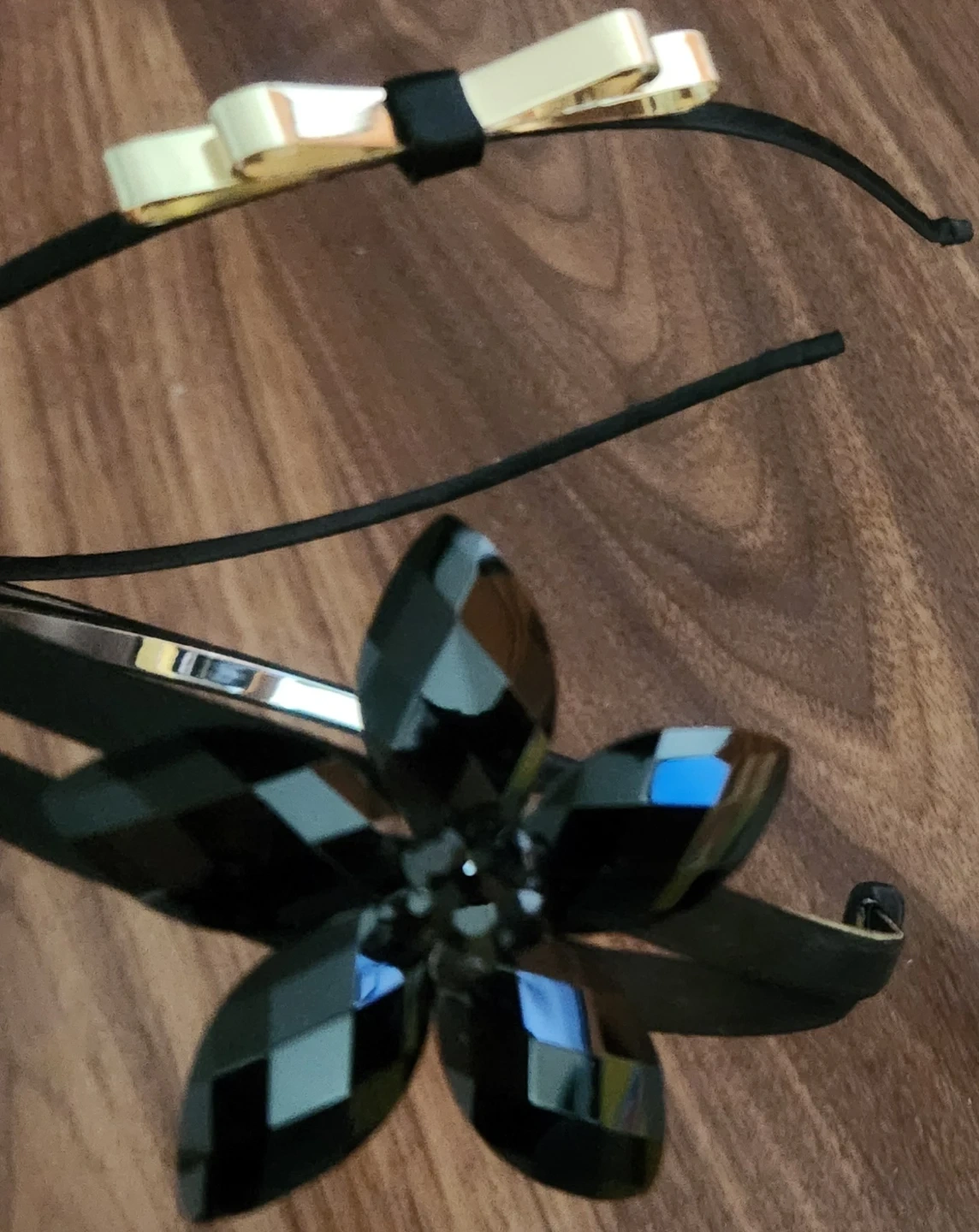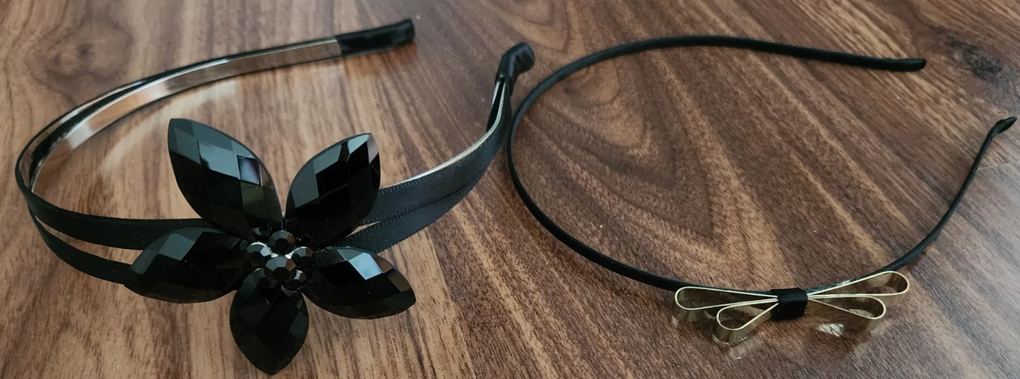 Selling a set of headbands. One with a black flower. Another has a small bow detail. They are both black.