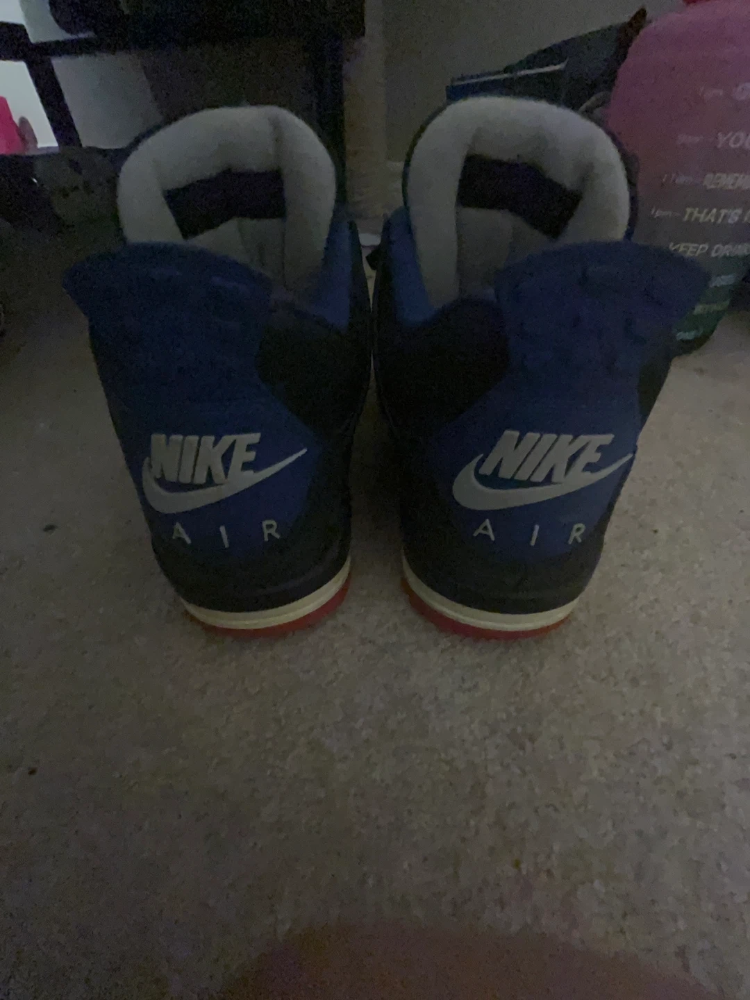 Selling a pair of Nike Air Jordan 4 Retro sneakers. They are black with blue and red accents, and in good condition. Size 12 men’s