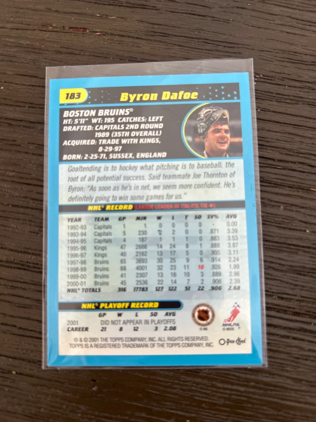 Byron Dafoe Boston Bruins O-Pee-Chee Hockey Card