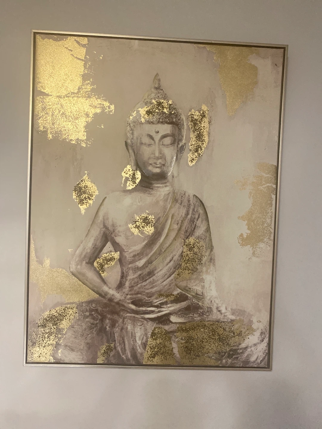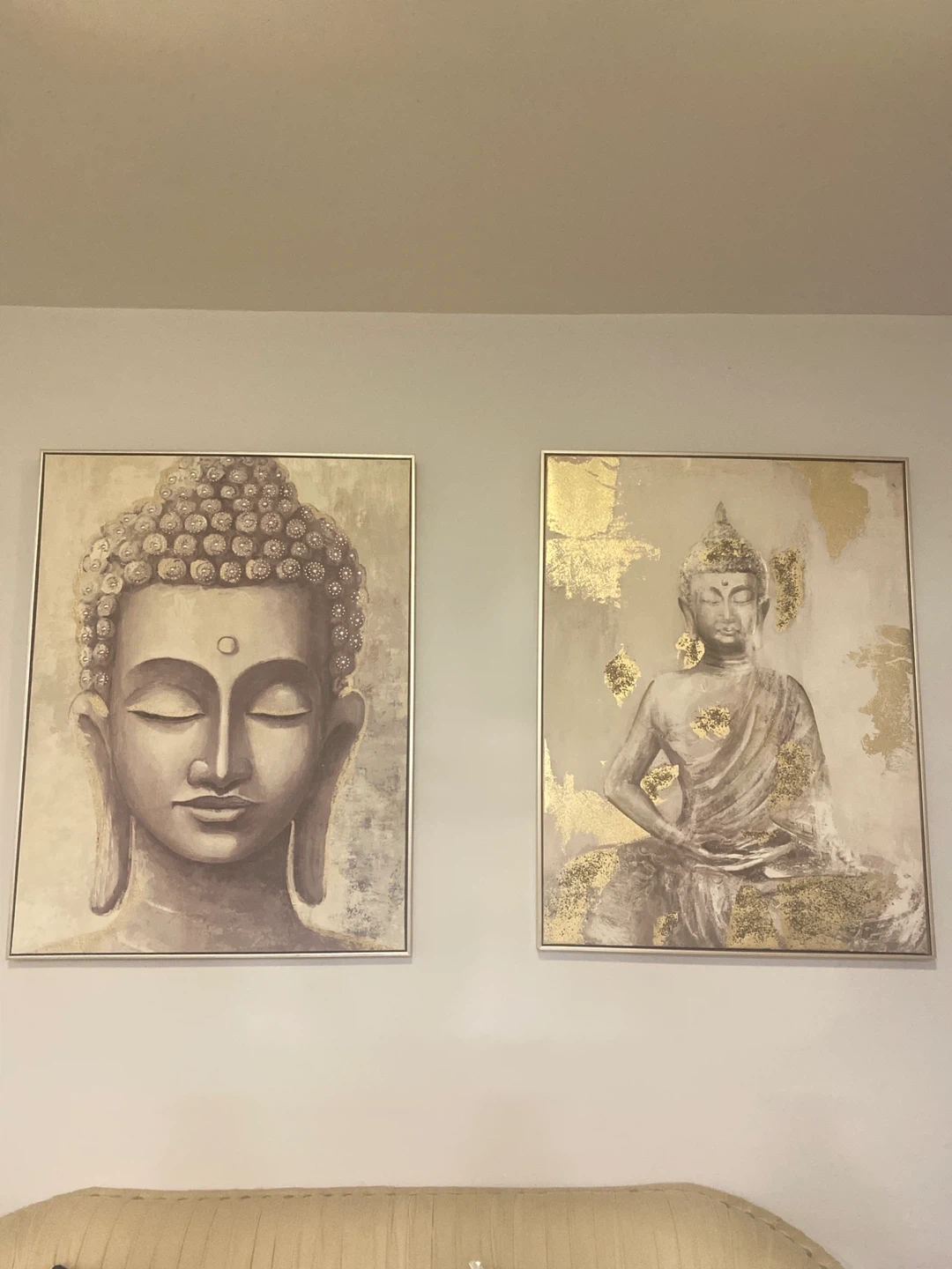 Selling a set of two Buddha canvas wall art pieces. They feature a serene Buddha design with gold accents. Perfect for adding a peaceful touch to any room!