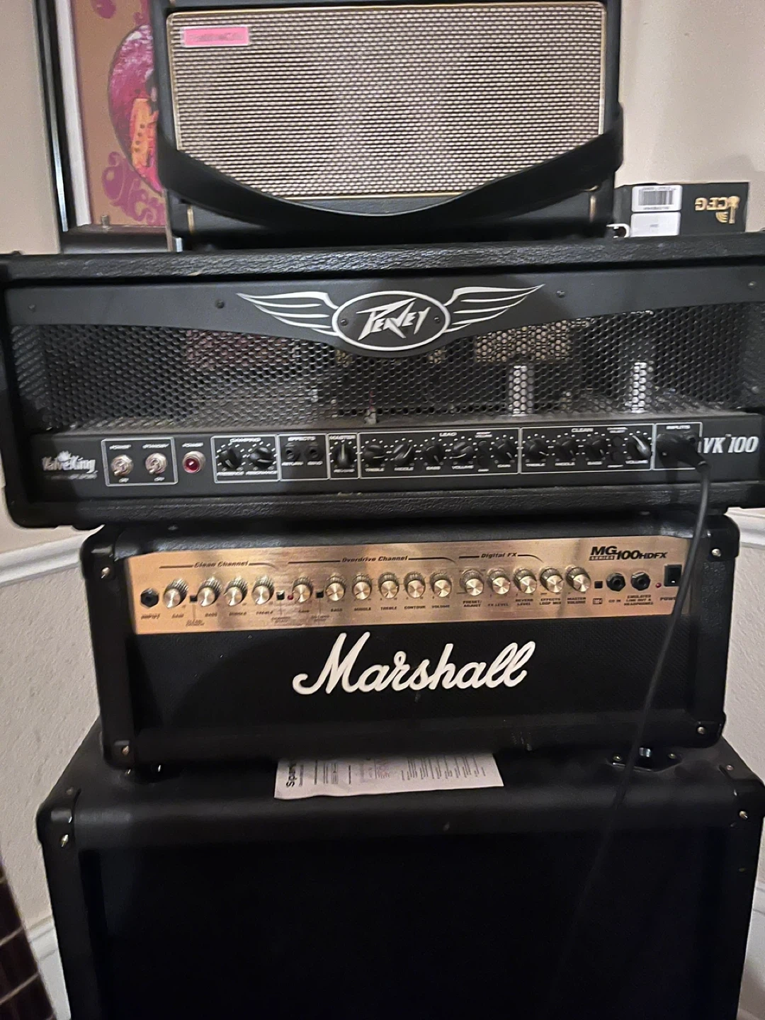 This is a Peavey ValveKing 100 guitar amp head. It's a tube amp with multiple channels and effects. This amp head is known for its versatility and powerful sound. It's great for gigging musicians or serious home users and marshal amp