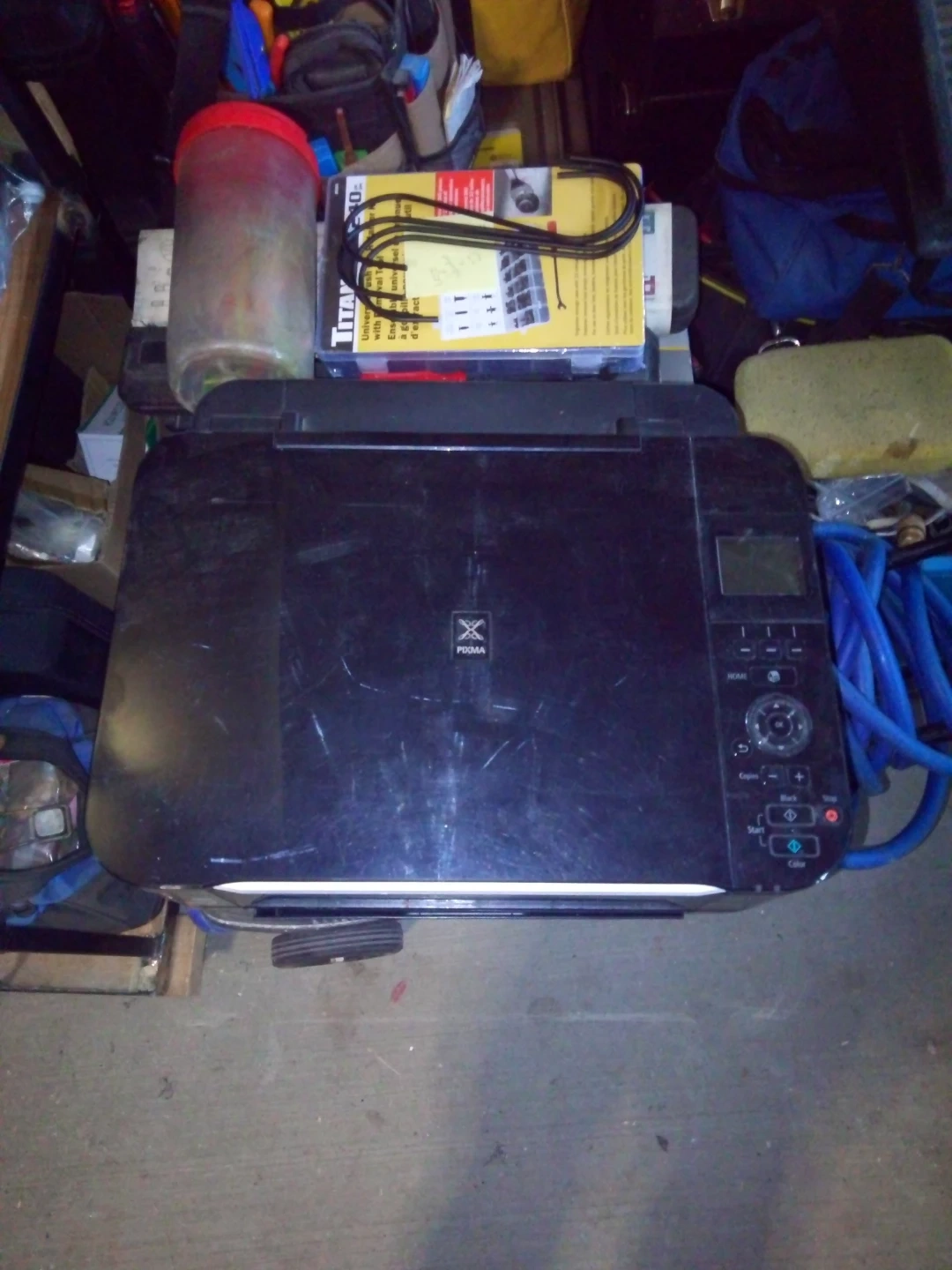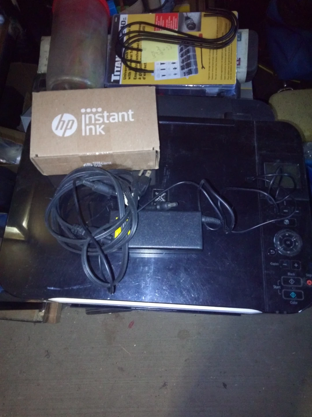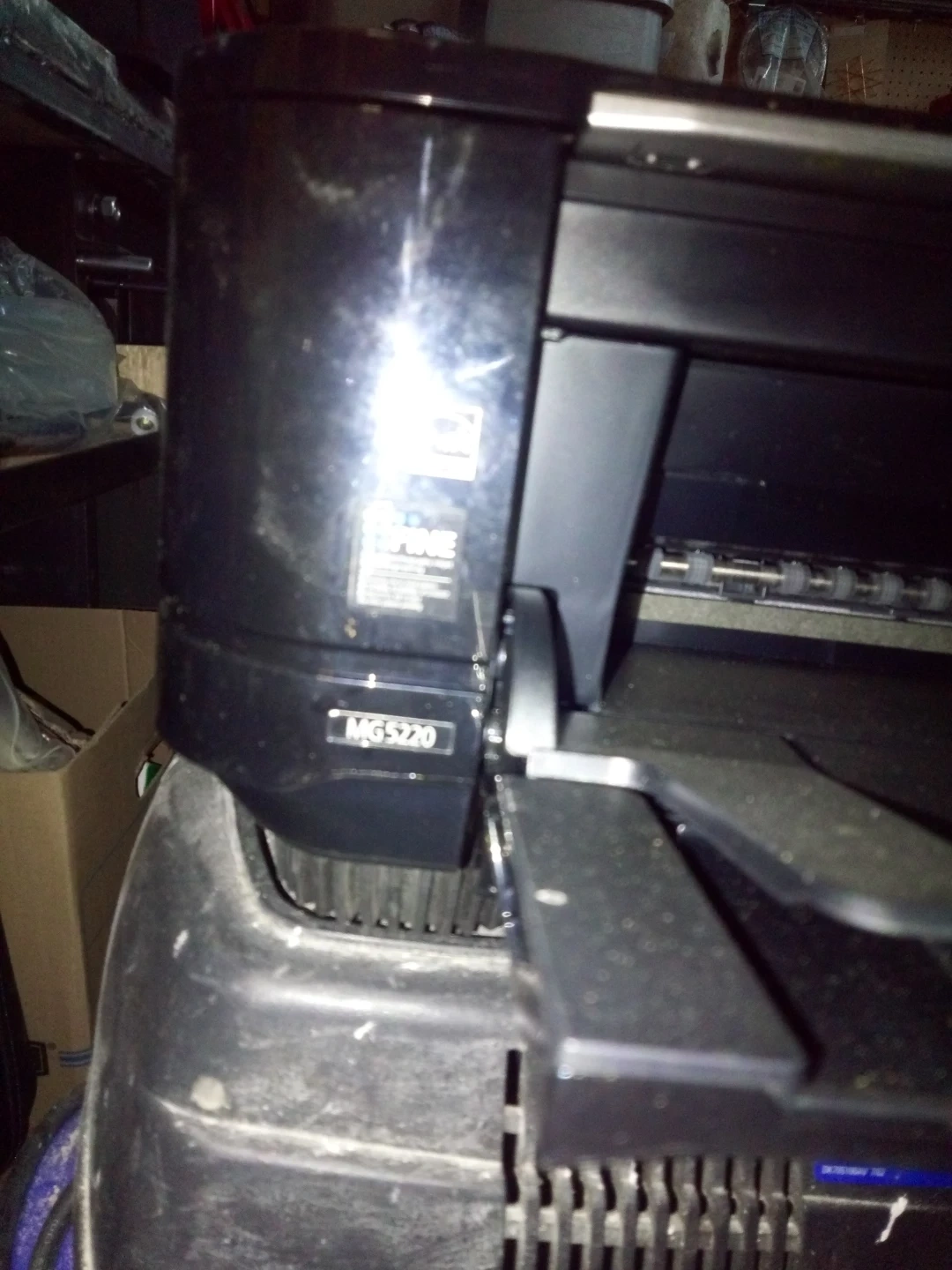 This is an HP PIXMA MG5220 all-in-one printer. It's a black, inkjet printer. Includes power cord and a box of HP Instant Ink. Has a few surface scratches from storage