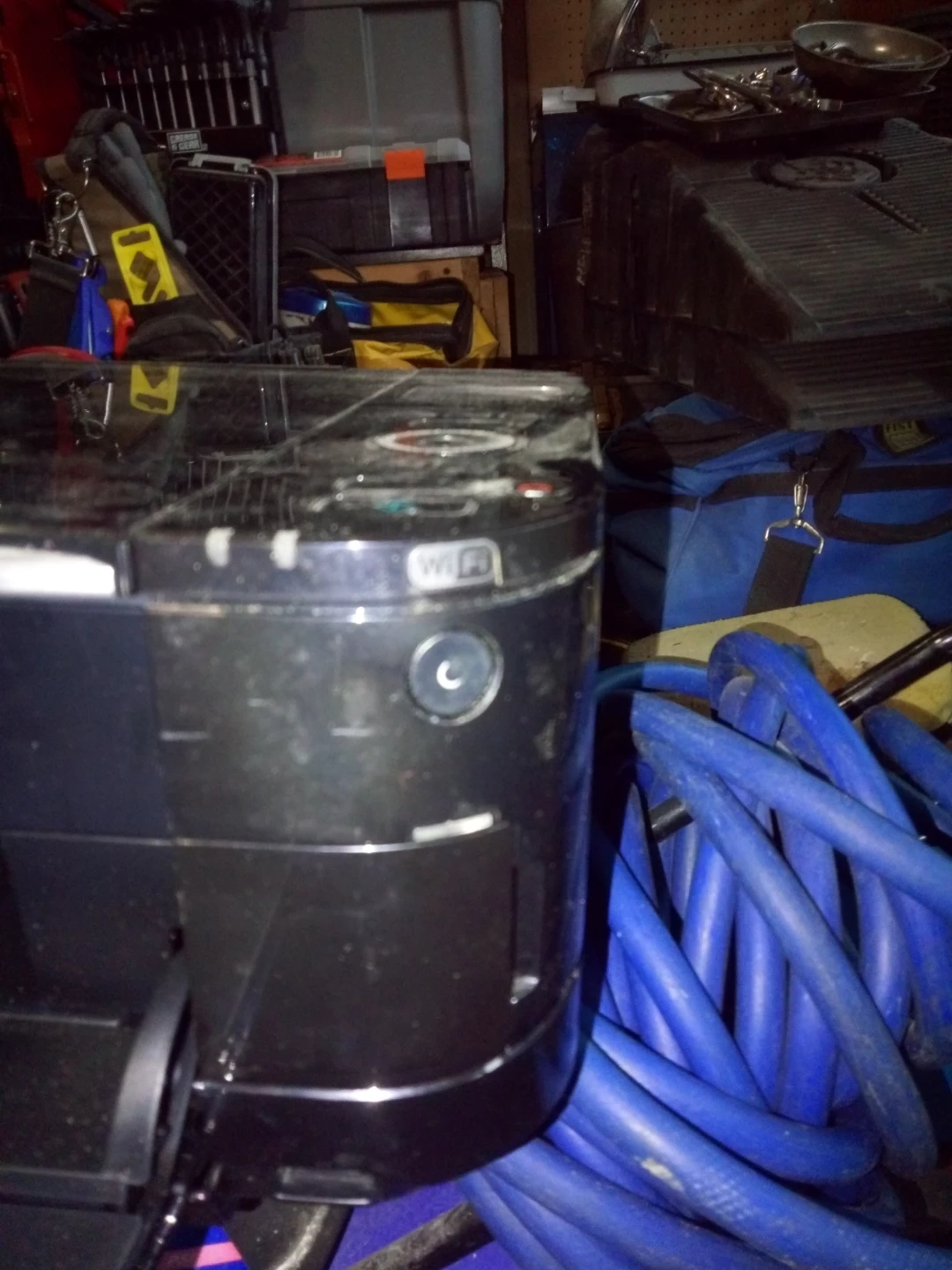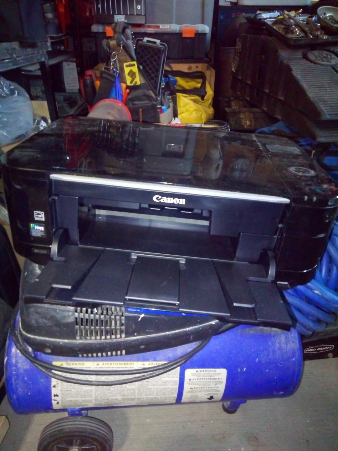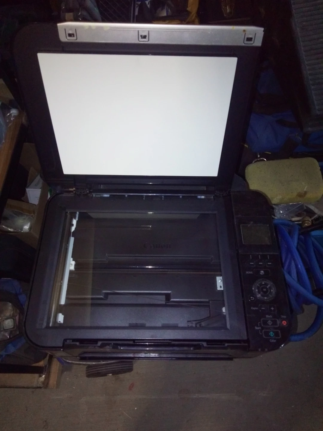 This is an HP PIXMA MG5220 all-in-one printer. It's a black, inkjet printer. Includes power cord and a box of HP Instant Ink. Has a few surface scratches from storage