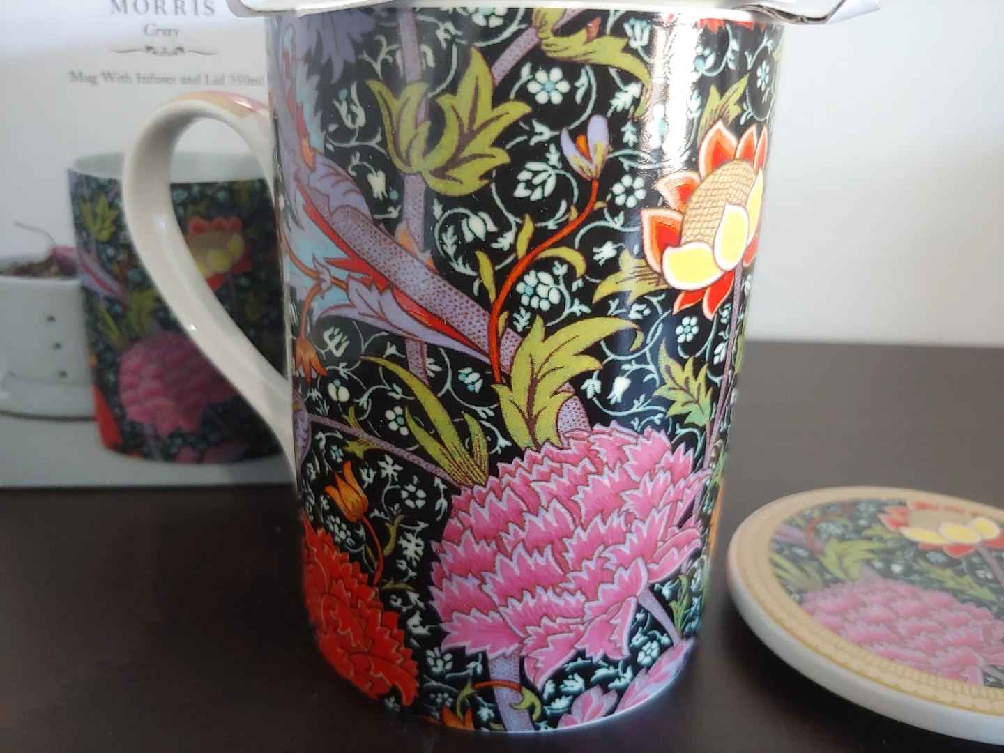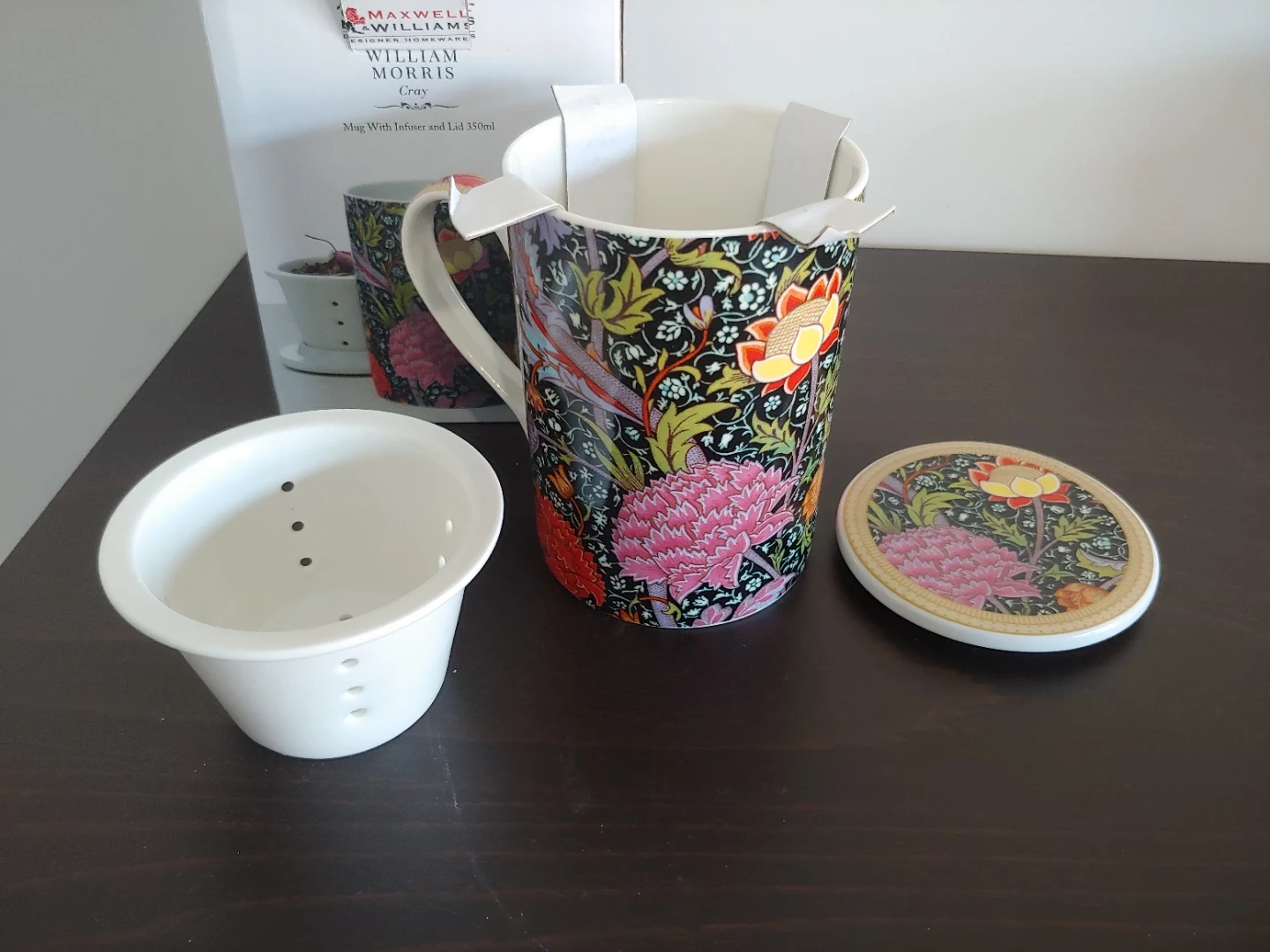 Selling a brand new Maxwell & Williams William Morris Gray mug with infuser and lid. It's a lovely porcelain mug with a beautiful floral design. The mug has a 350ml capacity and is both dishwasher and microwave safe. Comes with the original box!