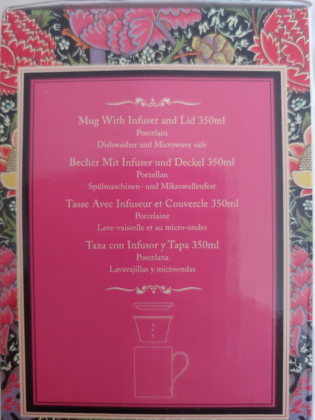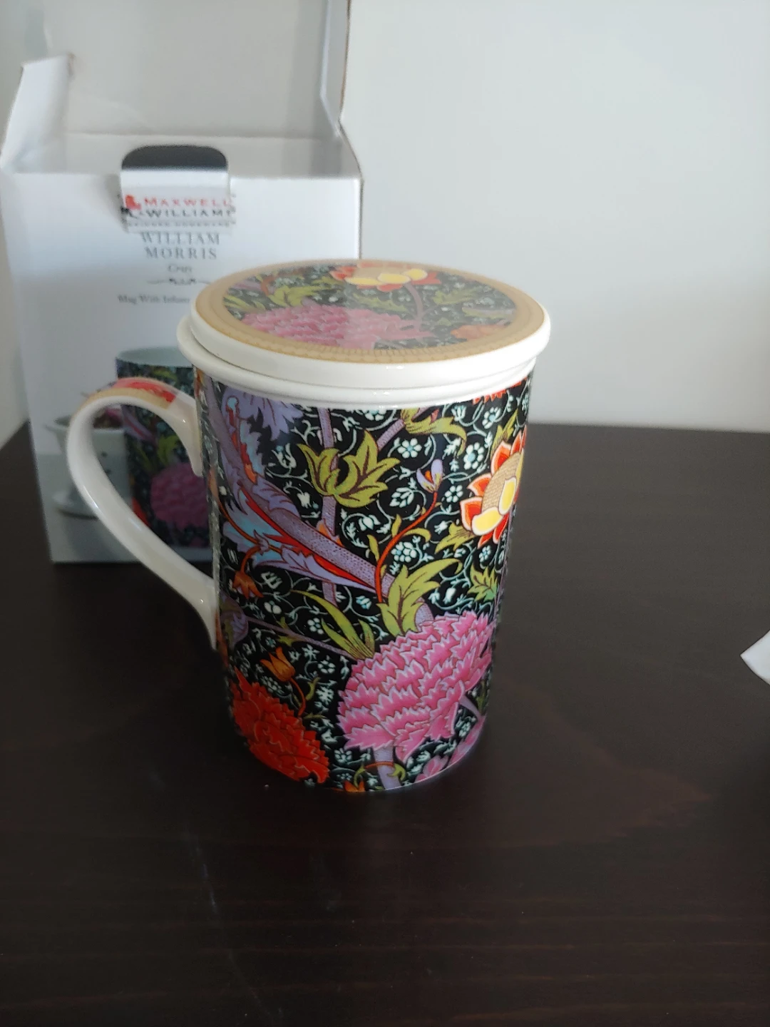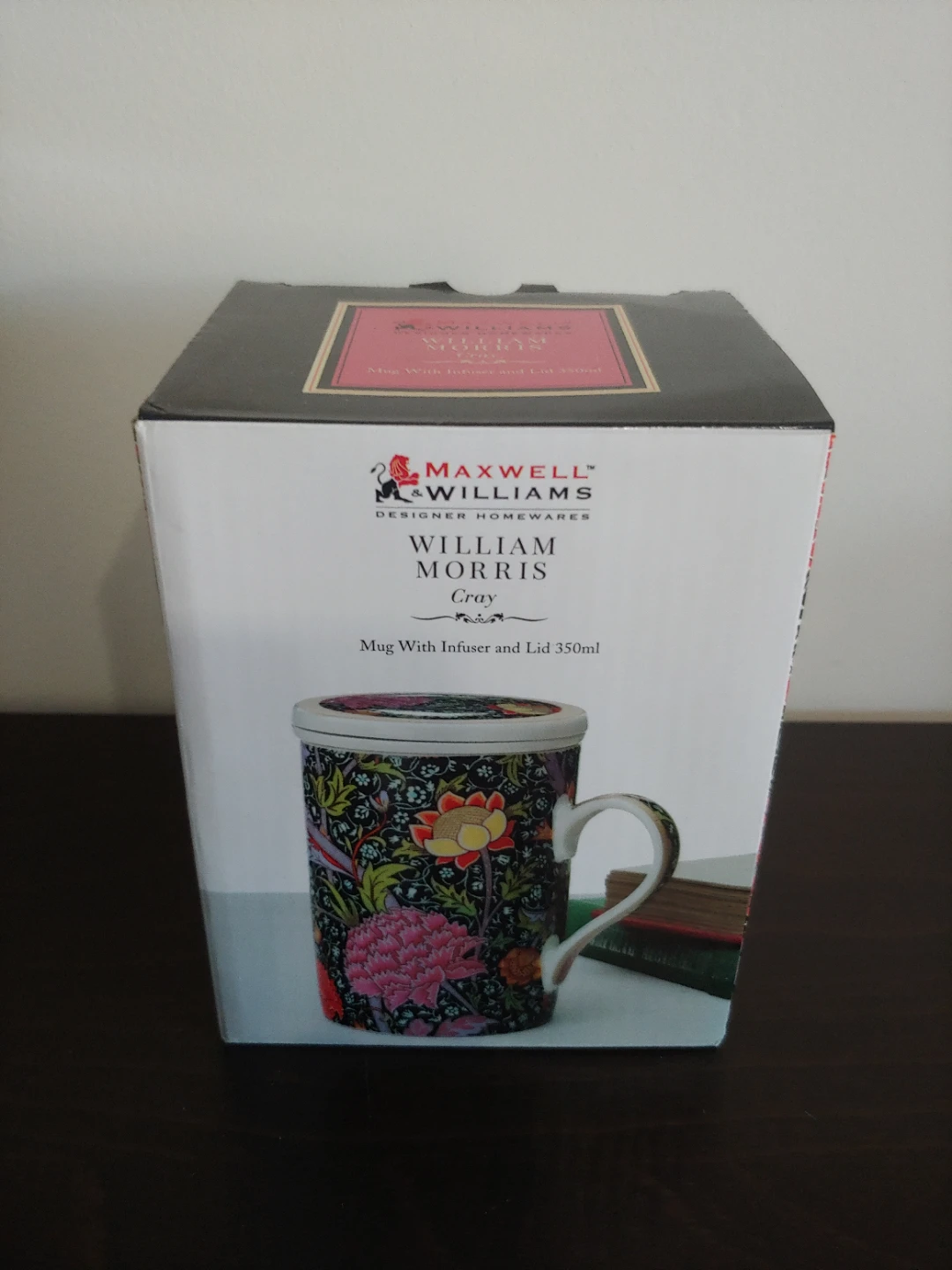 Selling a brand new Maxwell & Williams William Morris Gray mug with infuser and lid. It's a lovely porcelain mug with a beautiful floral design. The mug has a 350ml capacity and is both dishwasher and microwave safe. Comes with the original box!