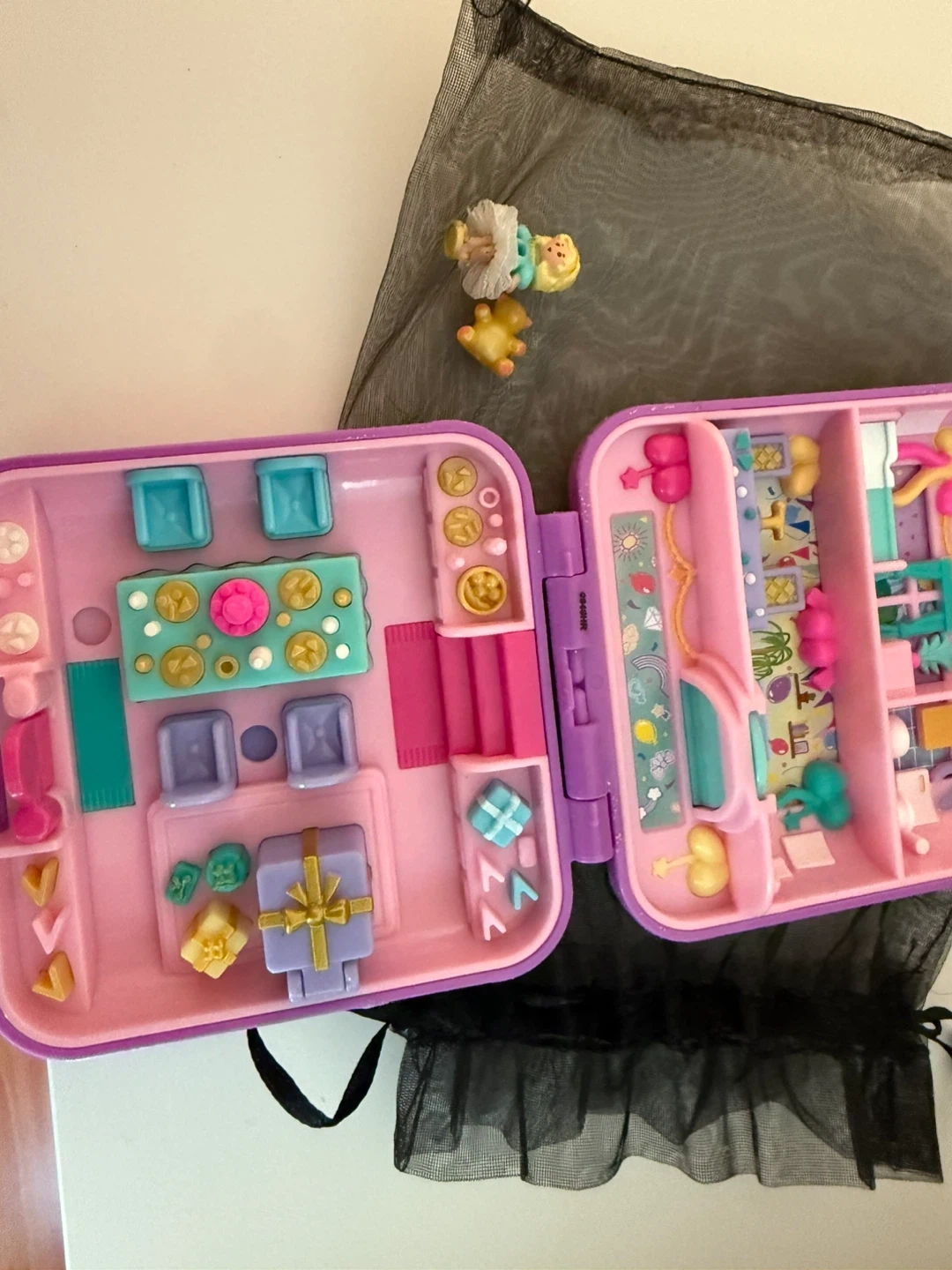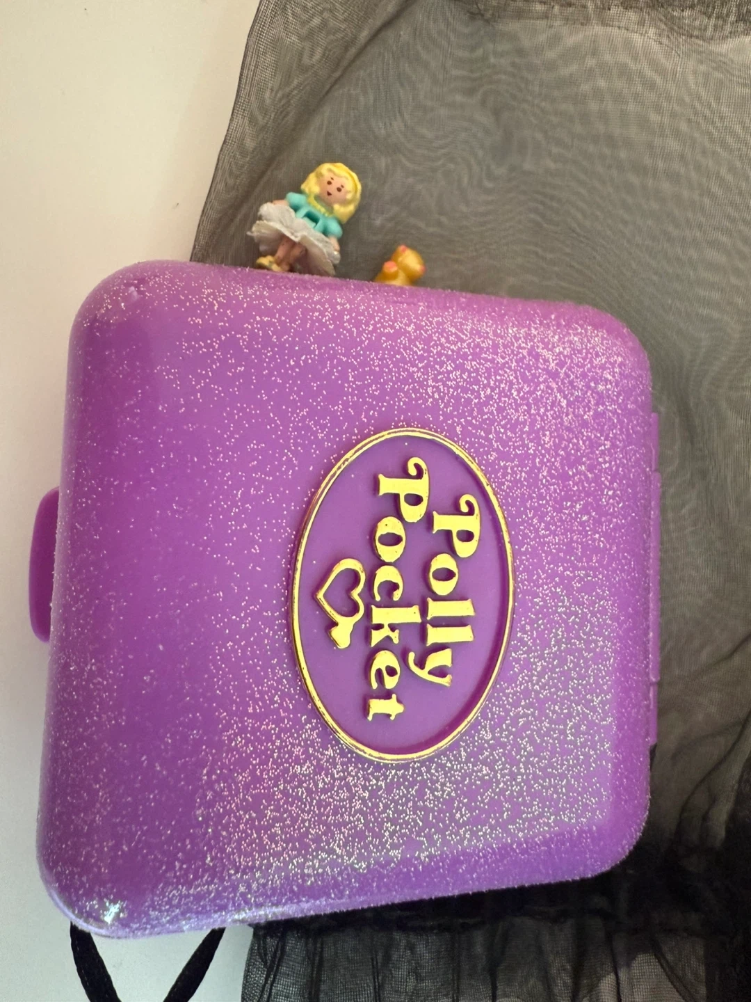 This is a vintage Polly Pocket compact playset. It folds up for easy storage and travel. Includes mini figures and accessories for imaginative play!