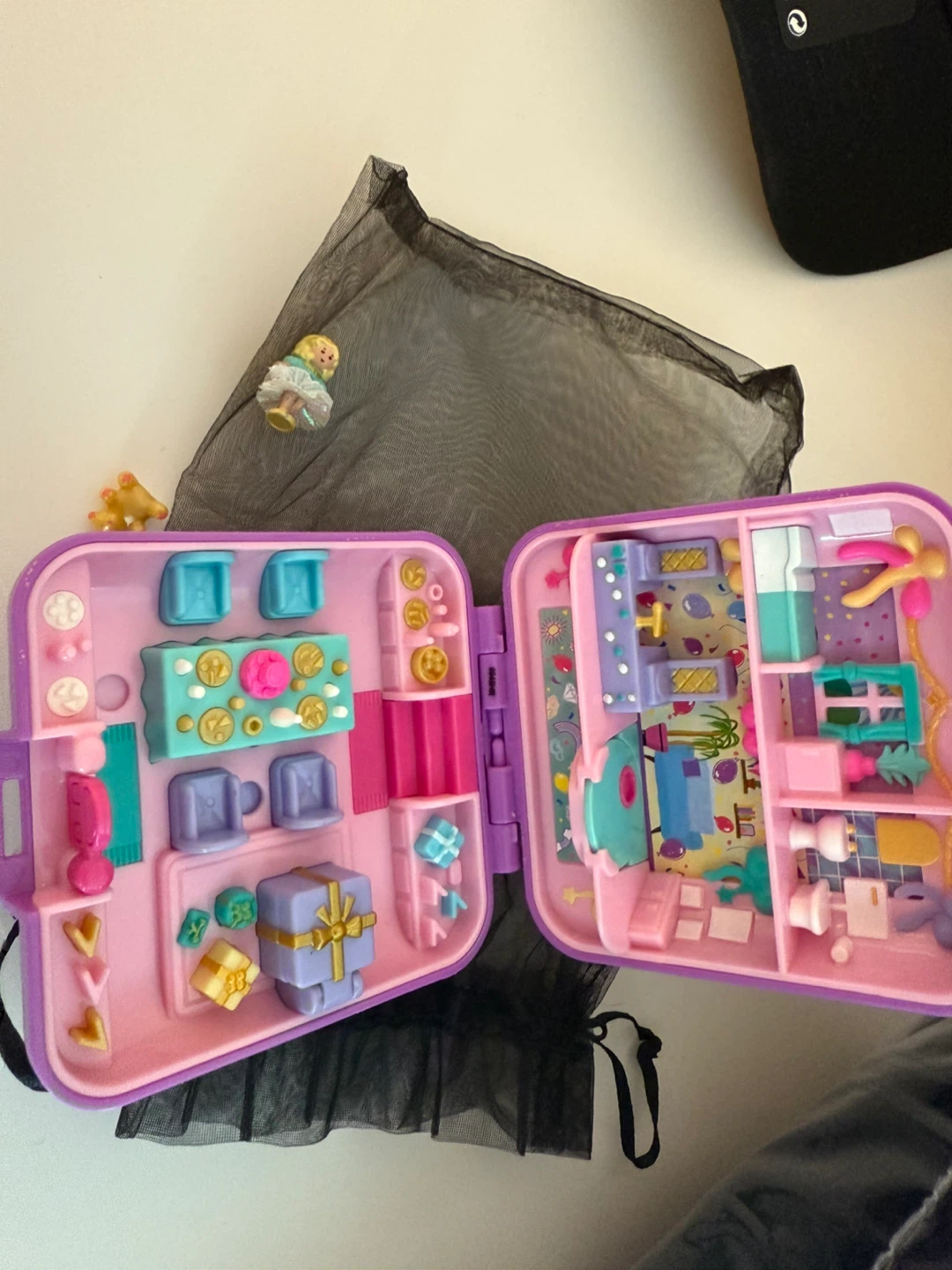 This is a vintage Polly Pocket compact playset. It folds up for easy storage and travel. Includes mini figures and accessories for imaginative play!