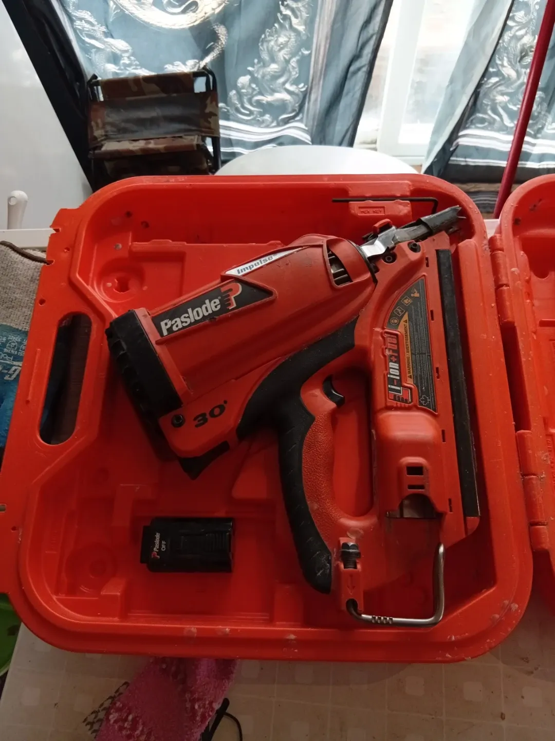 Paslode Impulse framing nailer in its original case. It's a orange and black cordless nail gun. Includes the hex key and battery pack.