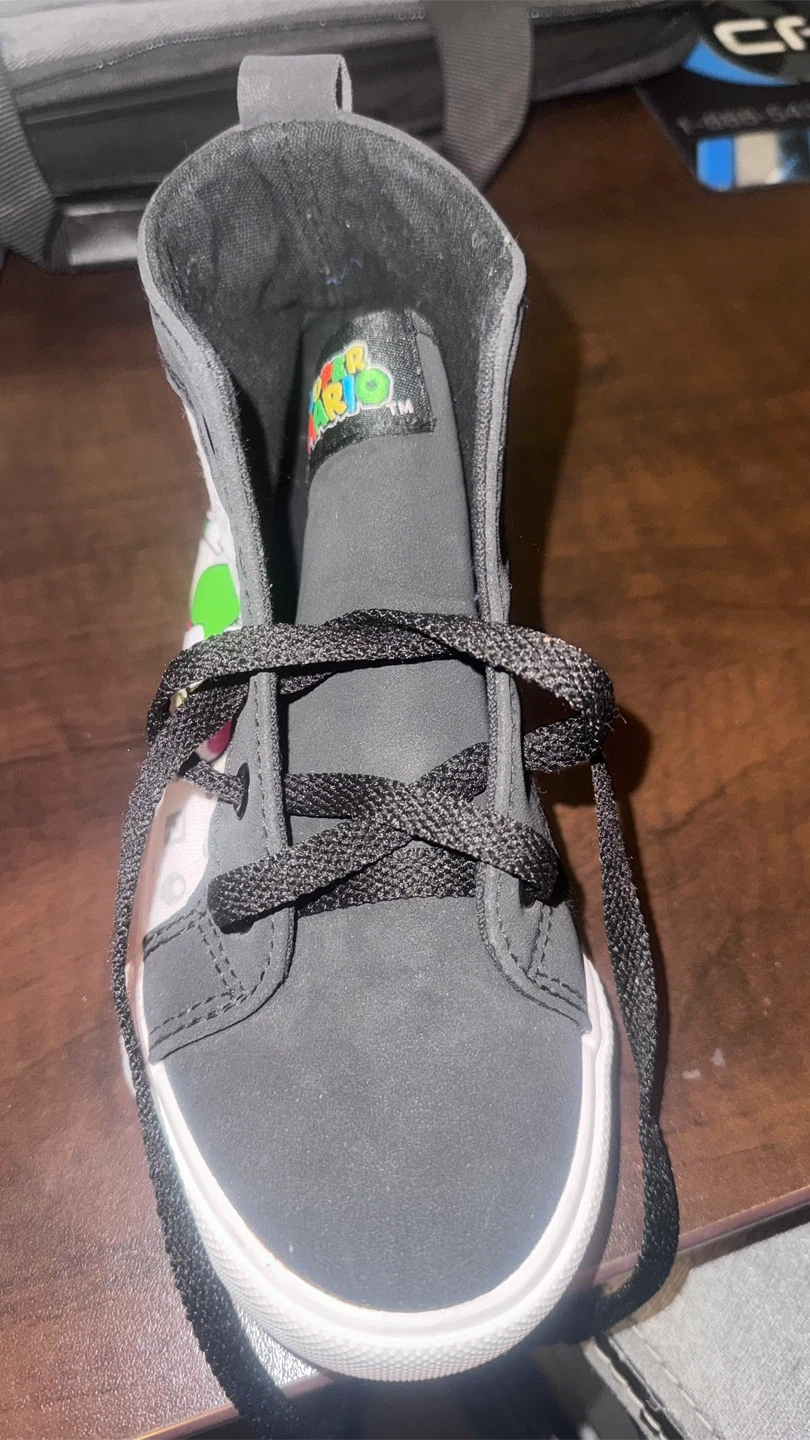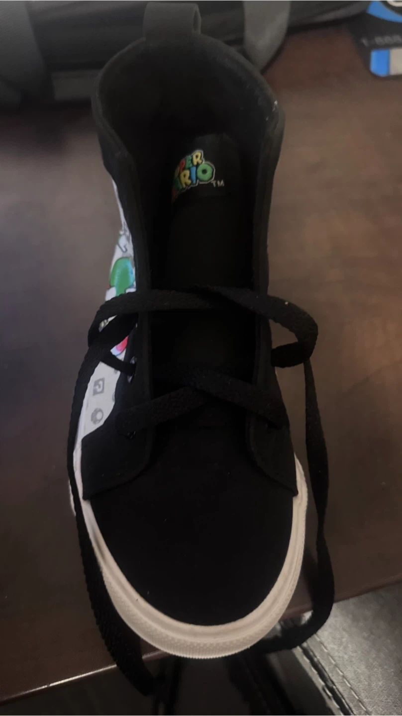 These black and white high-top Vans feature characters from Super Mario, including Mario, Luigi, Yoshi, and Toad. They're made with canvas material and have black laces. A fun pair for any fan of the classic video game franchise!