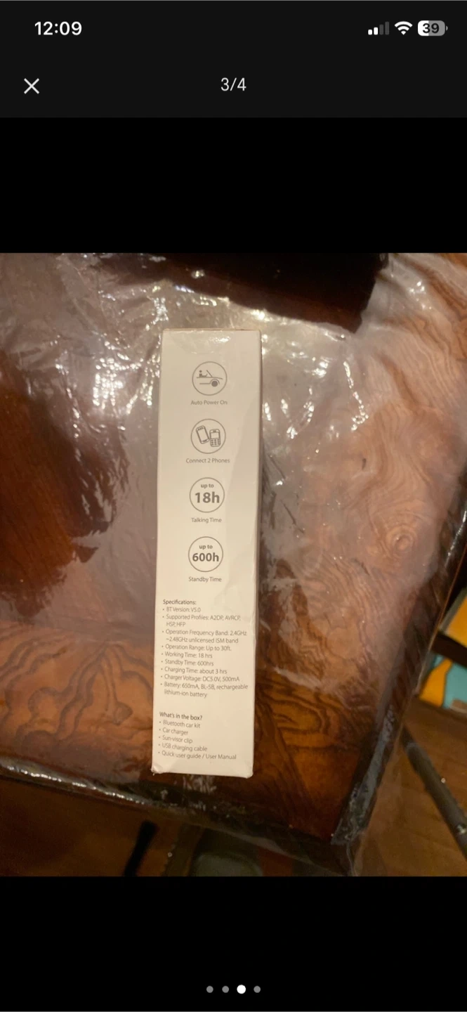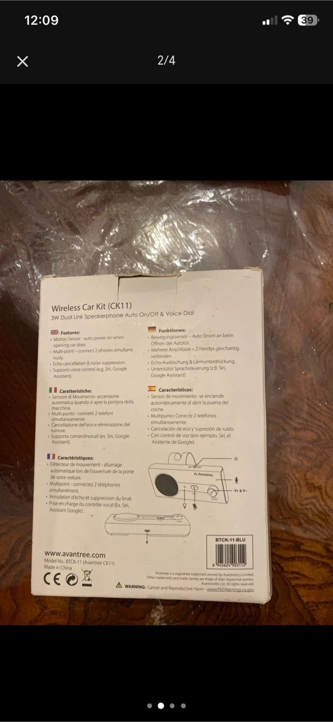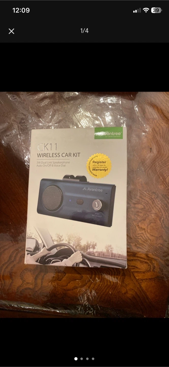 This is the Avantree CK11 wireless car kit speakerphone. It features auto power on and can connect to two phones simultaneously. Talking time is up to 18 hours, and standby time is up to 600 hours. Echo cancellation and noise suppression are included. This device would be useful for hands-free calling while driving.
