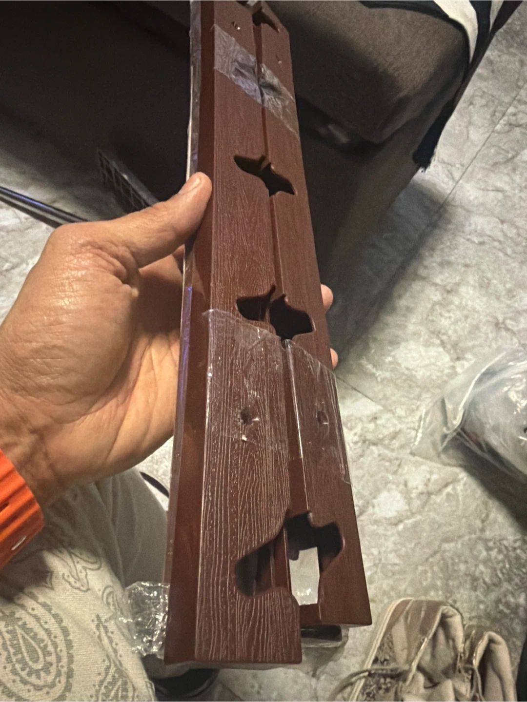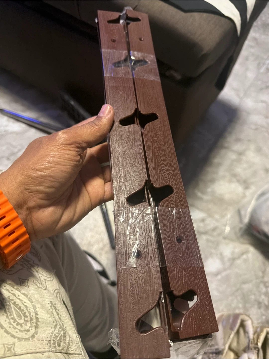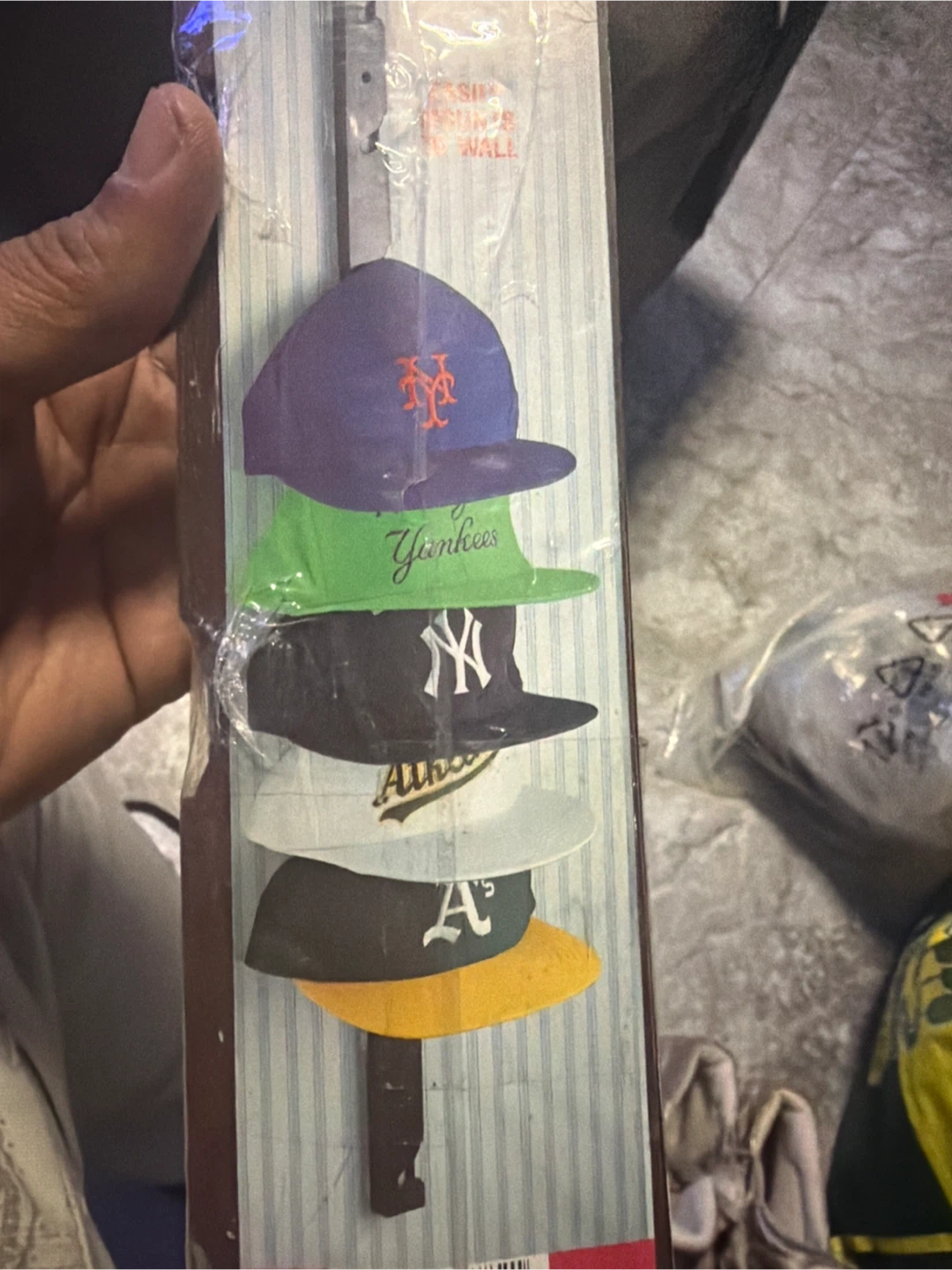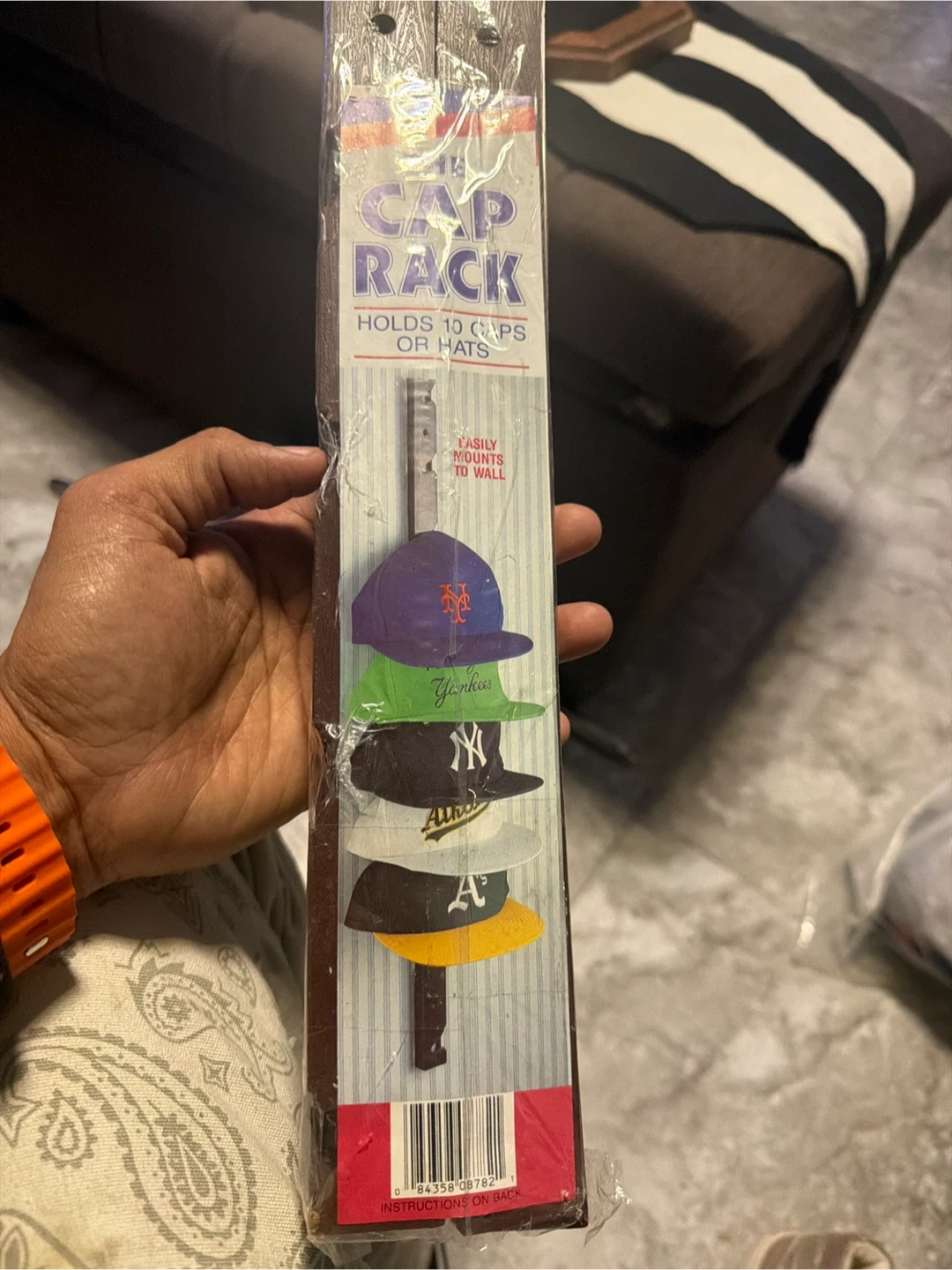 This wall-mounted cap rack holds up to 10 hats or caps. It features a wood-grain finish and mounts easily to the wall. It's a great way to organize your collection!