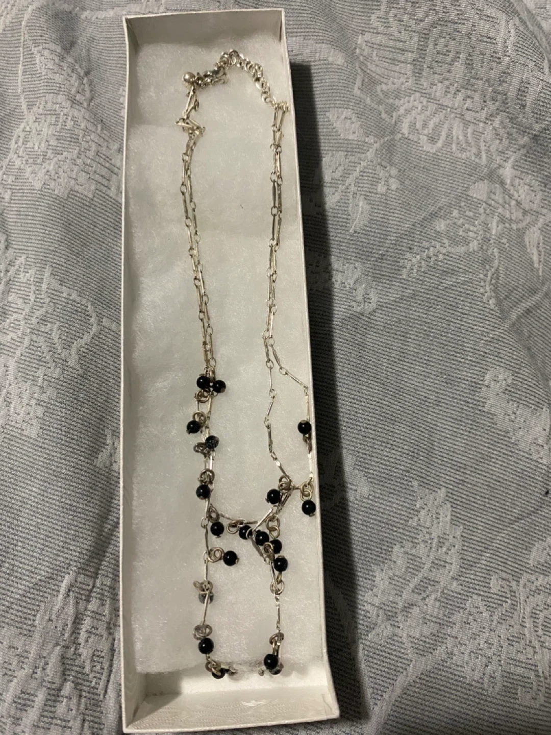 A delicate silver-tone necklace featuring small black beads. It's presented in a white jewellery box. The chain has a unique link design with beads spaced along its length.