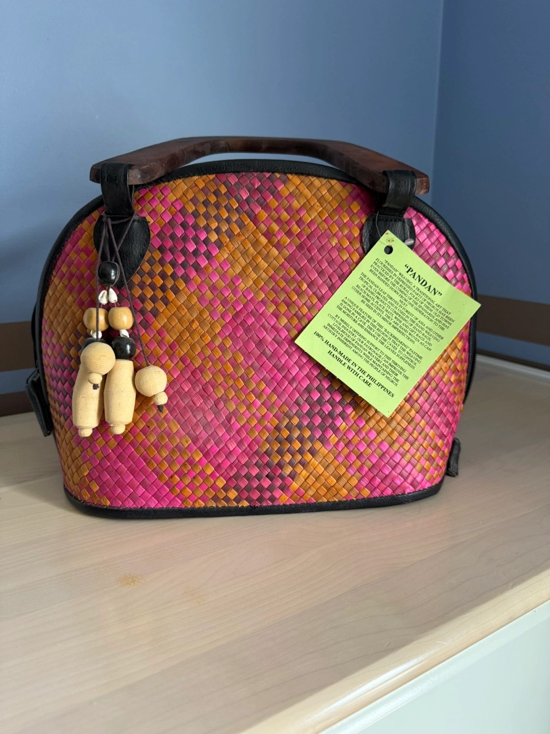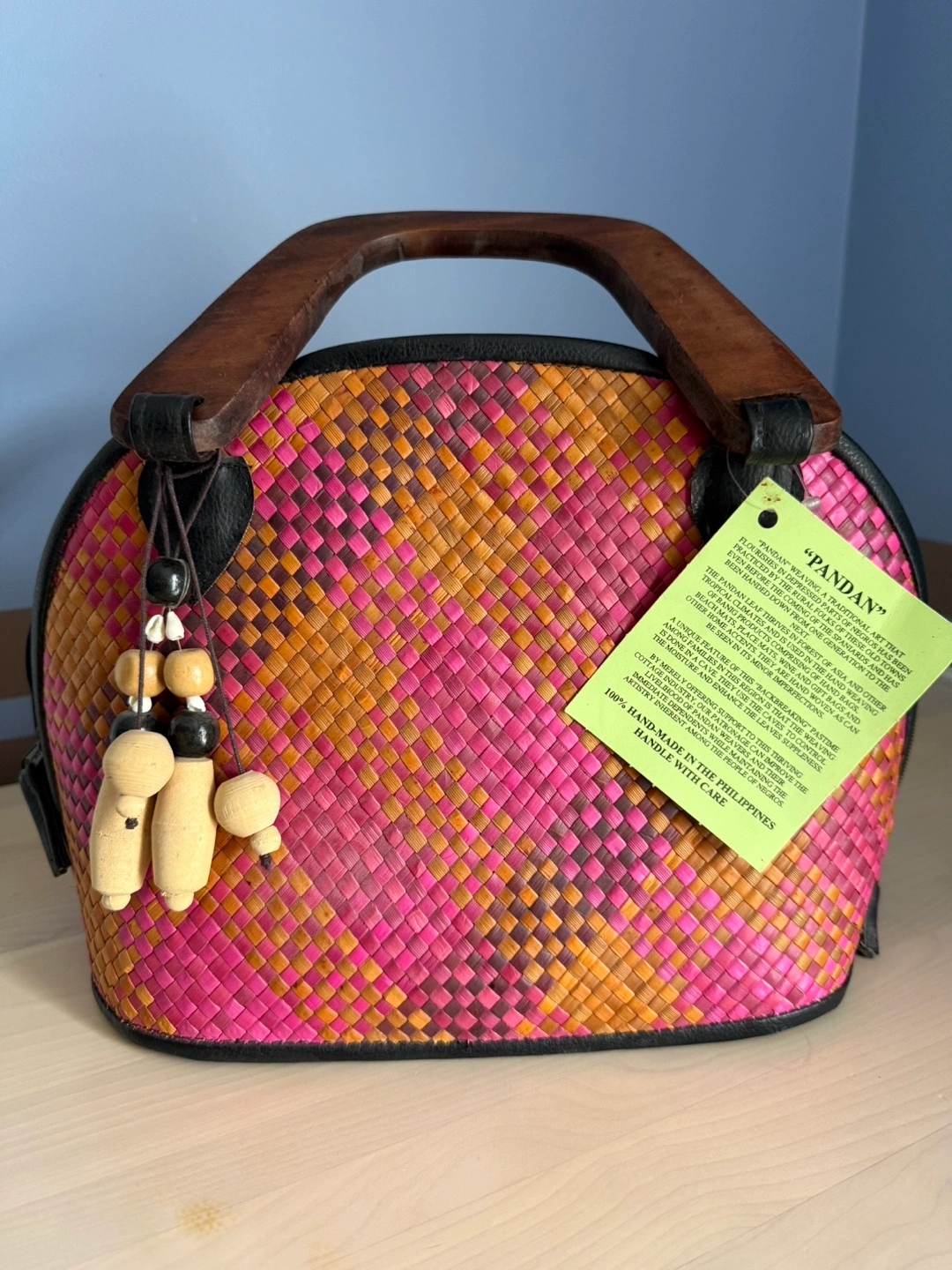 Unique woven handbag. Features a wooden handle and decorative charms. Beautiful pink and orange colours. Made in the Philippines.