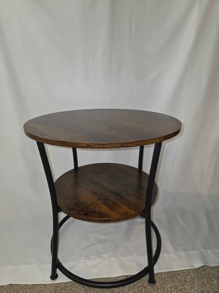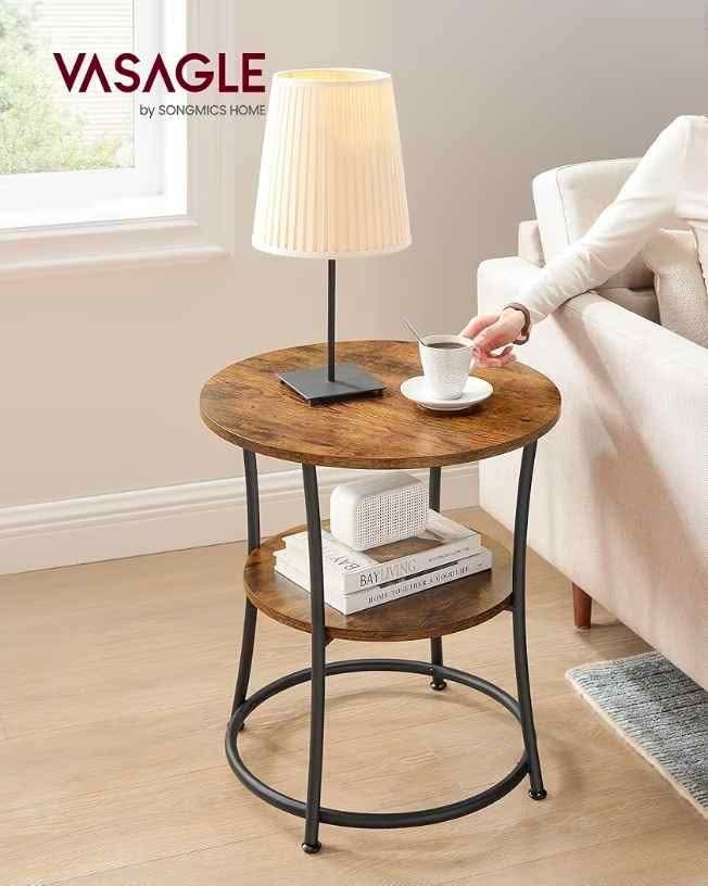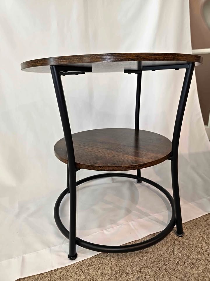 Modern industrial-style round coffee table with wood grain finish and sturdy black steel frame. Features two shelves for storage or display — perfect for living rooms, bedrooms, or offices. Compact, durable, and easy to assemble.