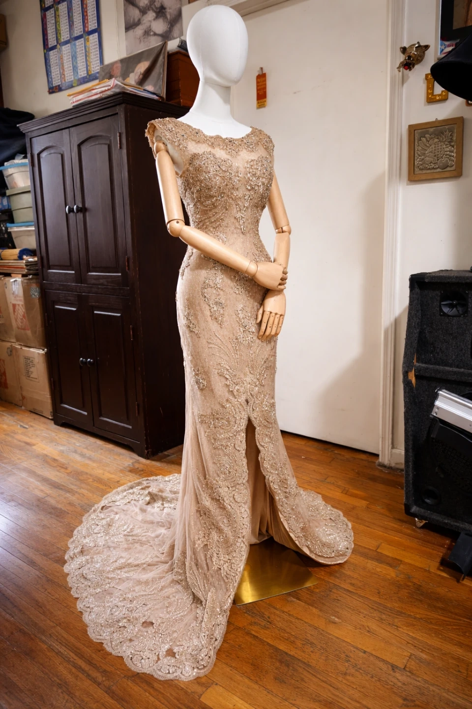Elegant floor-length gown with intricate beading and lace details. Features cap sleeves and a daring thigh-high slit. Fully lined with a stunning train. Perfect for formal events or galas!