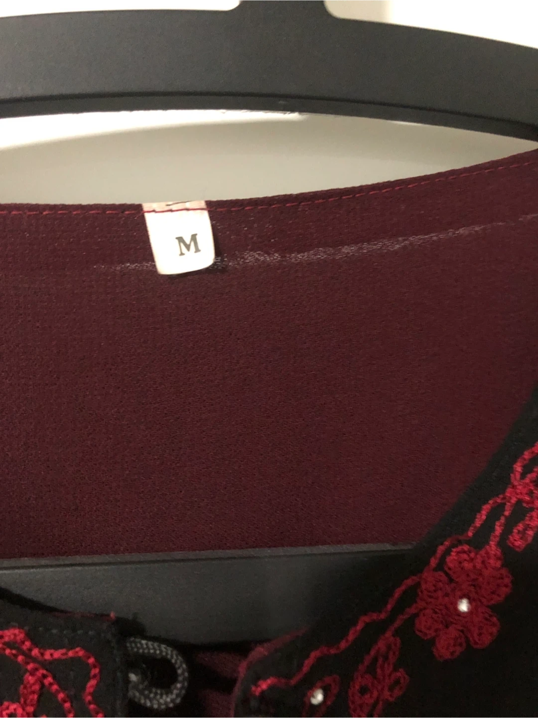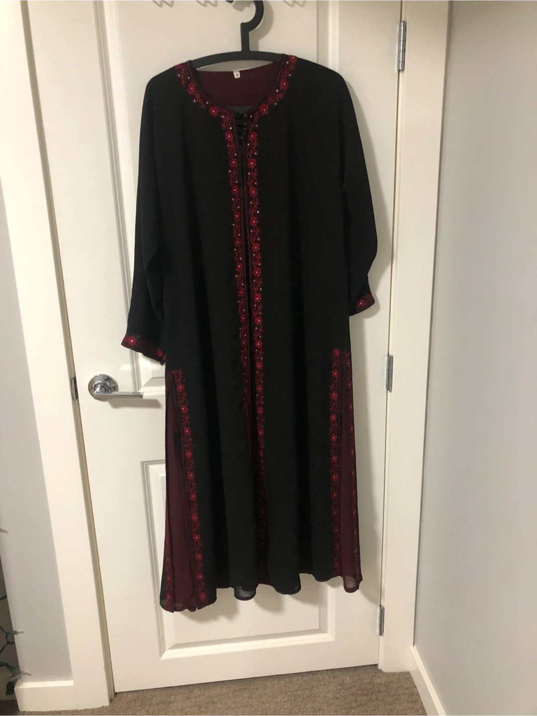 This black abaya features intricate red floral embroidery along the neckline, front opening, and cuffs. It's made of a lightweight fabric and has a contrasting burgundy lining. The size tag reads M. Cash only