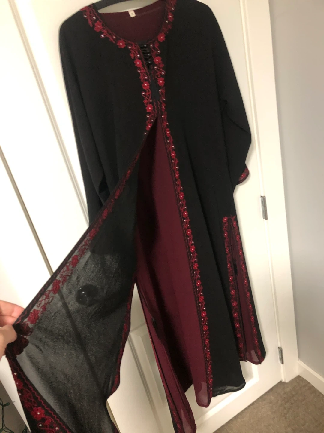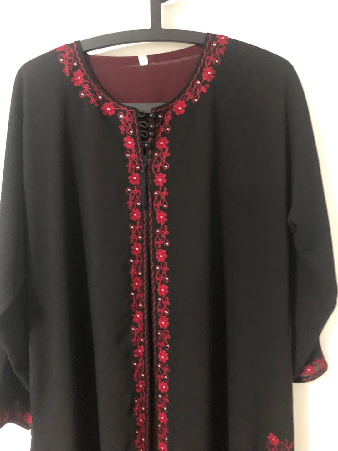 This black abaya features intricate red floral embroidery along the neckline, front opening, and cuffs. It's made of a lightweight fabric and has a contrasting burgundy lining. The size tag reads M. Cash only