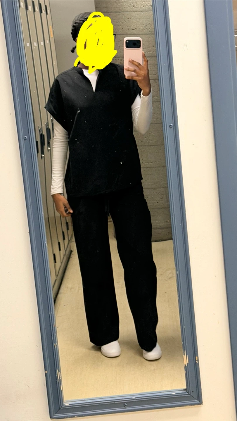 This is a black scrub set including a V-neck scrub top and matching scrub pants. The top has short sleeves and a white undershirt is worn with it. The pants have a drawstring waist and are wide-legged.