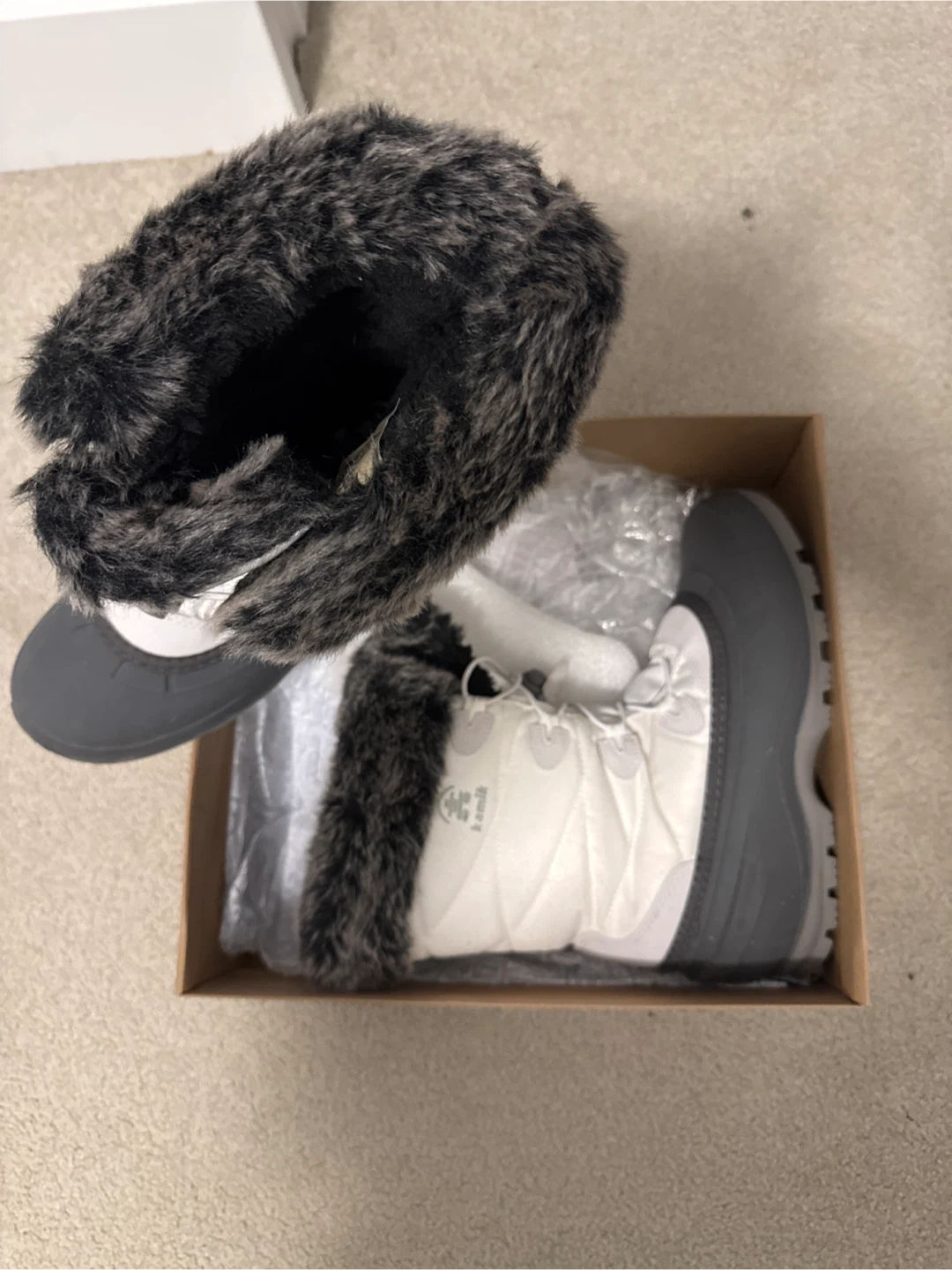 Kamik women's winter boots in white and grey. These boots have a cozy faux fur lining and a waterproof exterior. They come with the original box. Size 8.