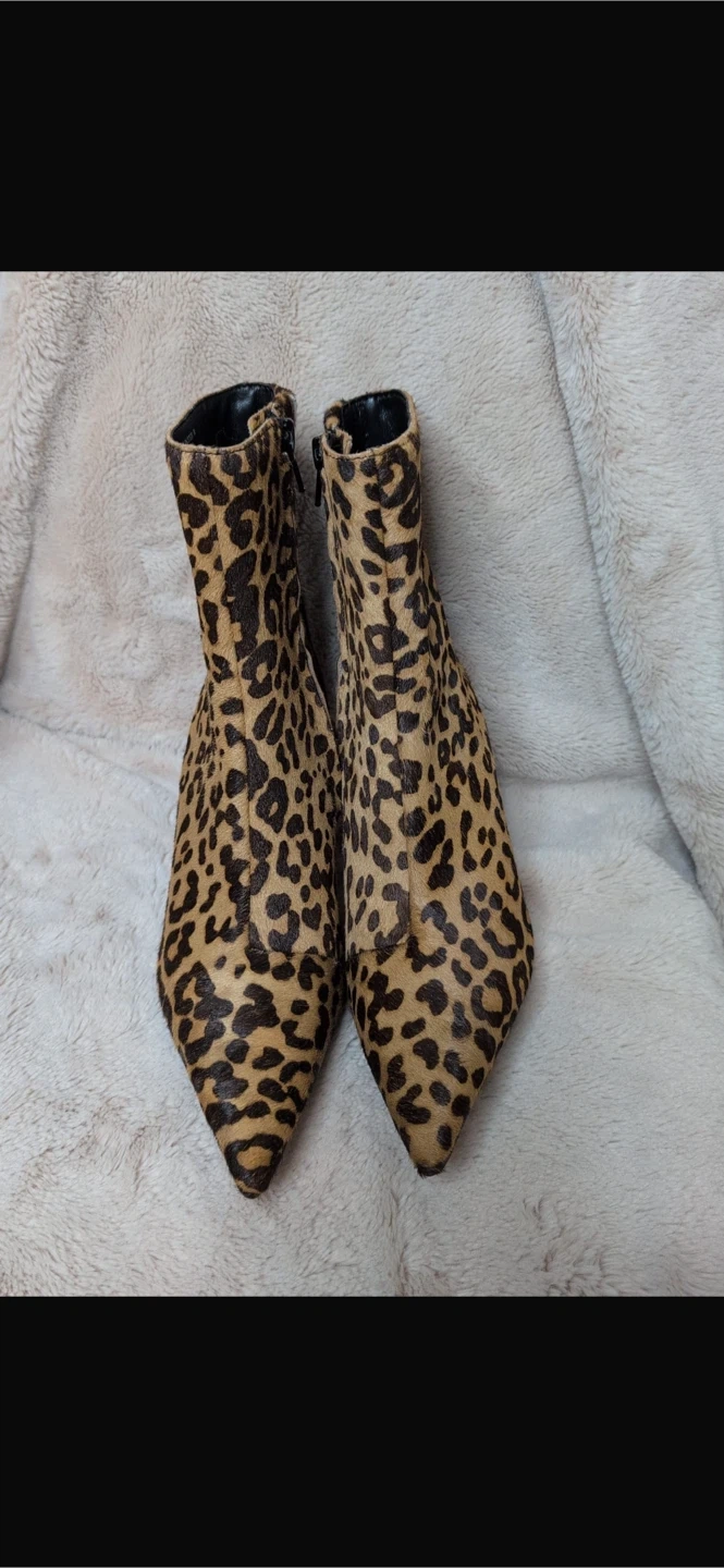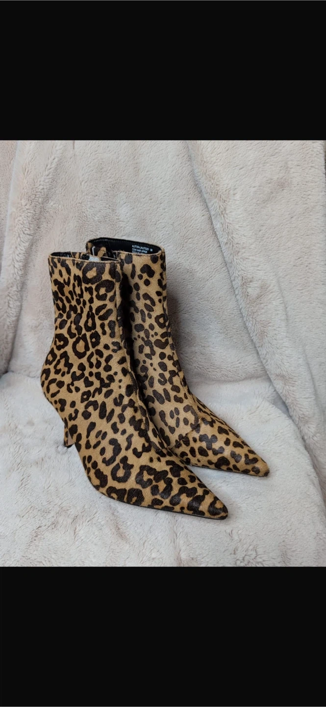 These stylish ankle boots feature a bold leopard print. They're made with pony hair and have a pointed toe with a kitten heel. A chic addition to any outfit!