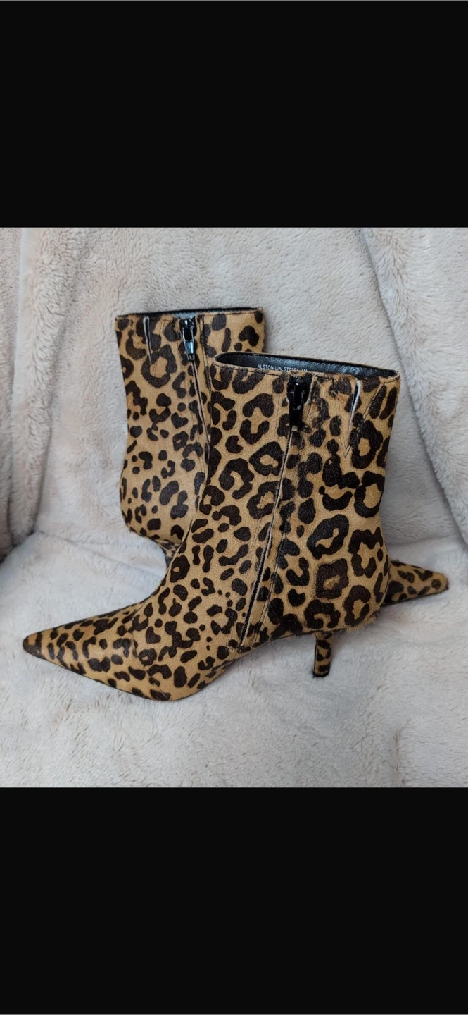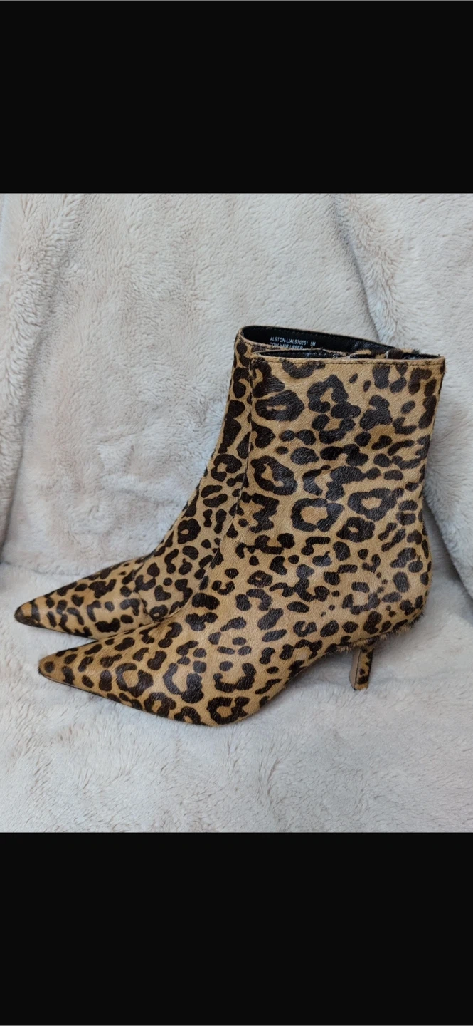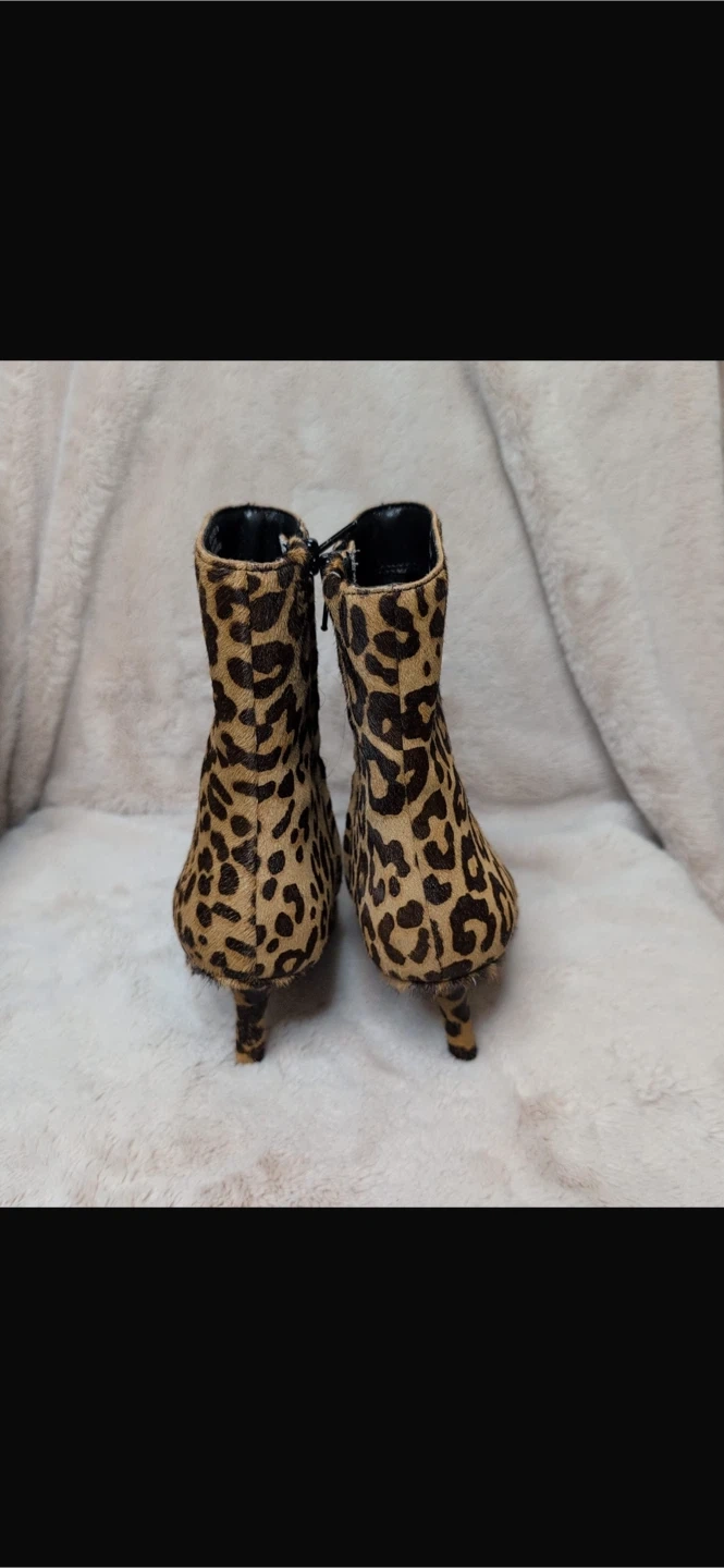 These stylish ankle boots feature a bold leopard print. They're made with pony hair and have a pointed toe with a kitten heel. A chic addition to any outfit!