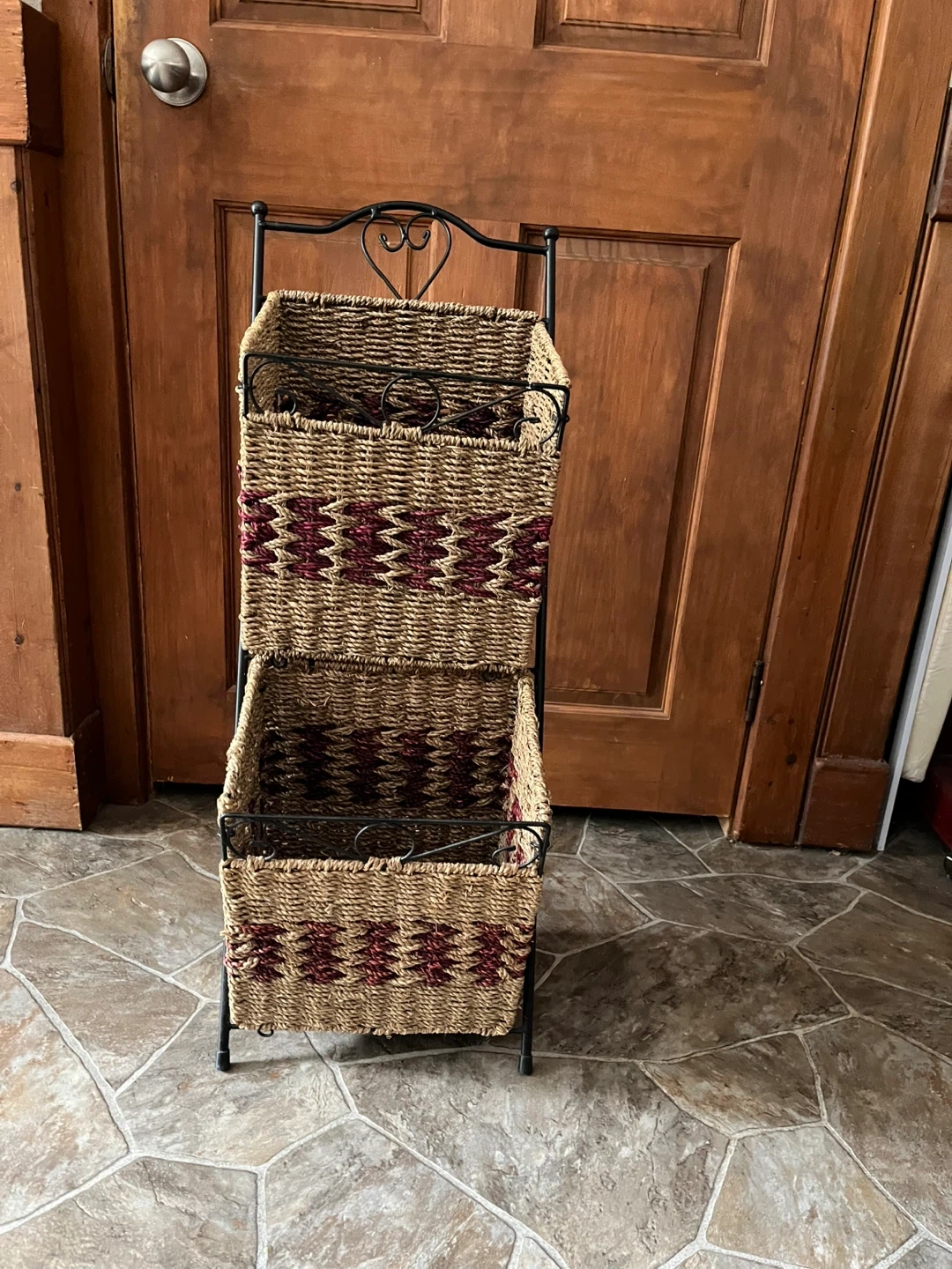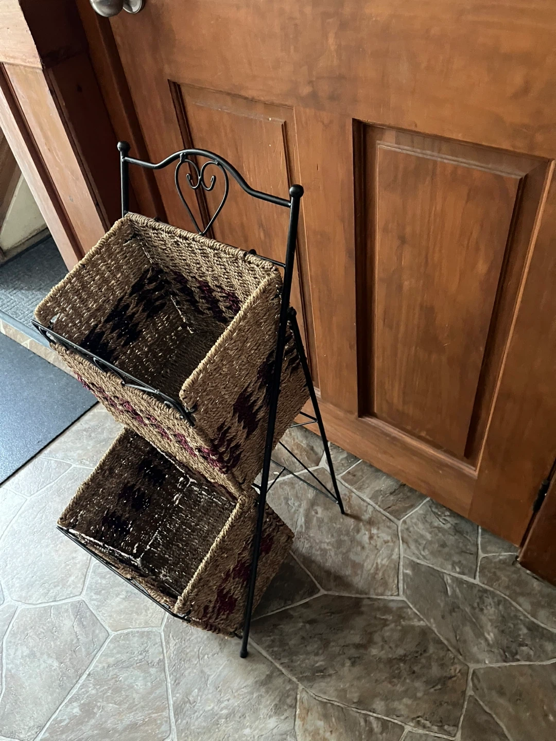 Vintage Two-tier wicker basket stand in great condition! Perfect for storing magazines, mail, or other items. The stand has a black metal frame with two woven wicker baskets. It's a stylish and functional addition to any room