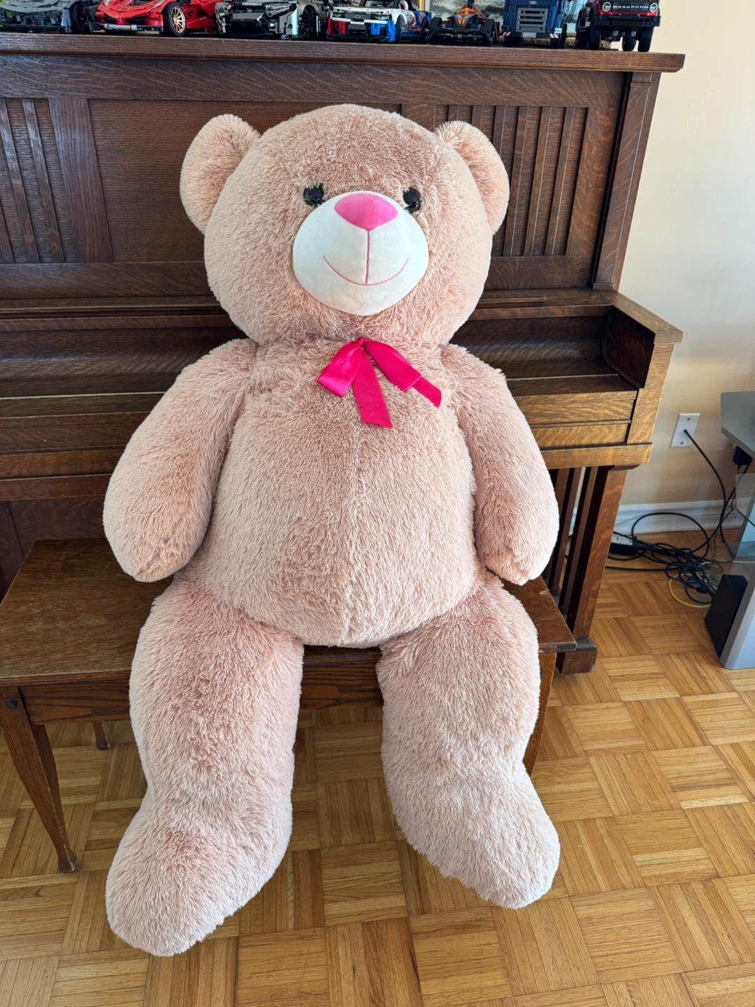 This is a large, soft teddy bear plush toy. It's a light pink colour with a pink ribbon tied around its neck. Its fur is fluffy and inviting. This bear would make a great cuddle buddy!