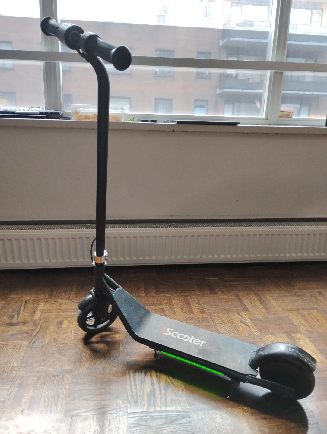 This black iScooter electric scooter is ready for your commute. It features a digital display on the handlebars and LED accent lights. This scooter is designed for urban travel. The e brake is not working only the normal brake is working. Negotiable
